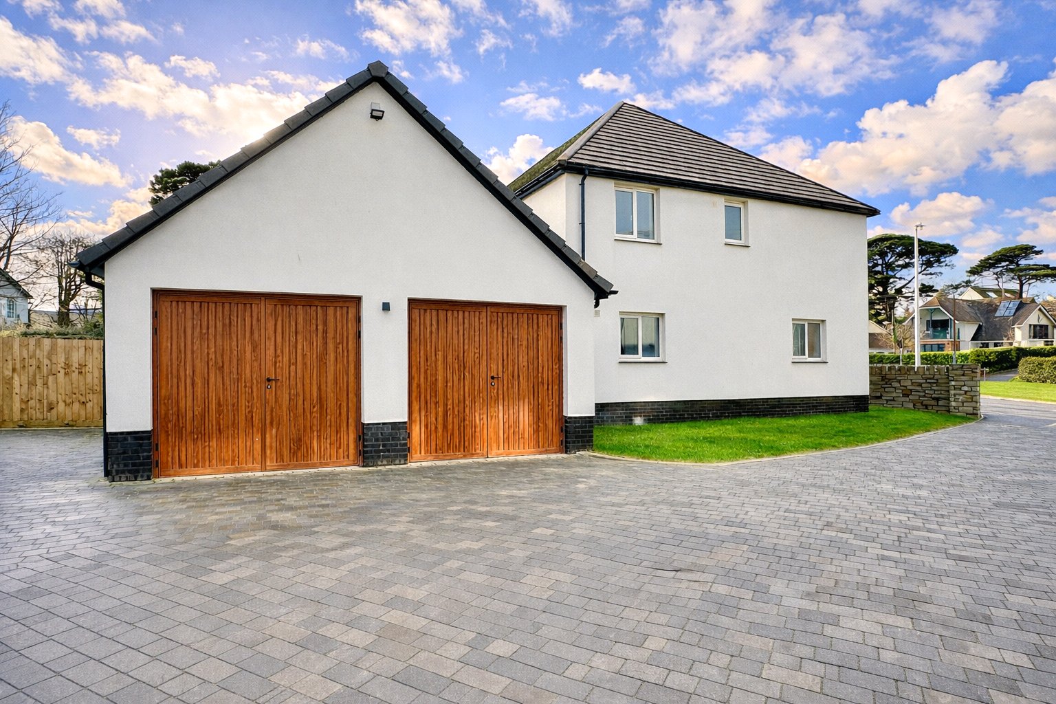 The double garage, fitted with an electric door and a personnel door into the utility room, adds everyday convenience, while additional driveway parking for two vehicles ensures practicality for busy households.