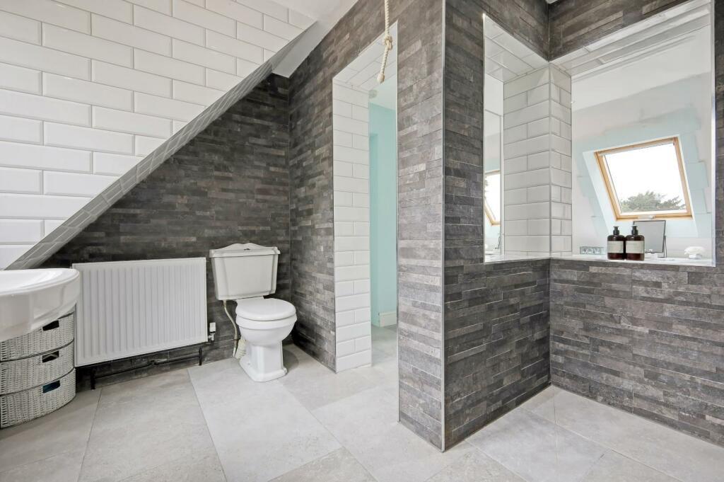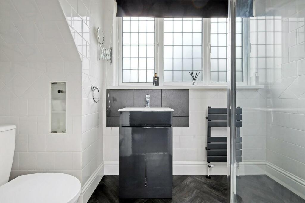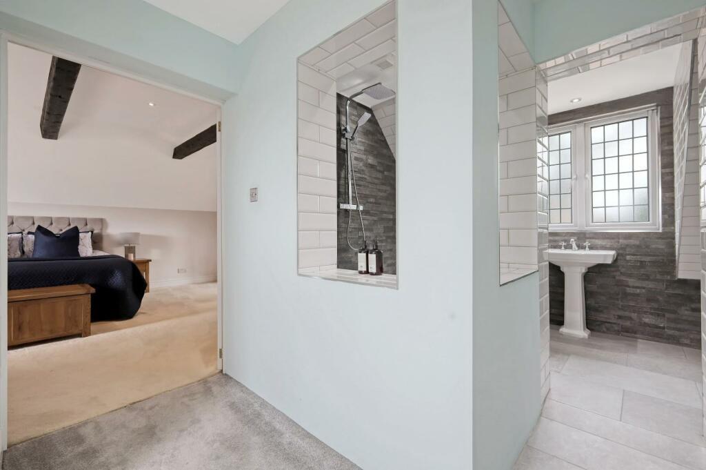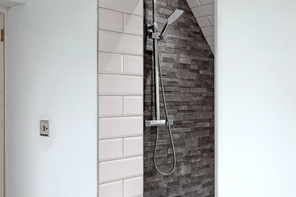 En-Suite Shower Room - Stylishly tiled with brick effect white tiles and dark grey brick slips. Walk-in shower cubicle with hand held attachment and overhead rainfall shower. w.c and wash hand basin.