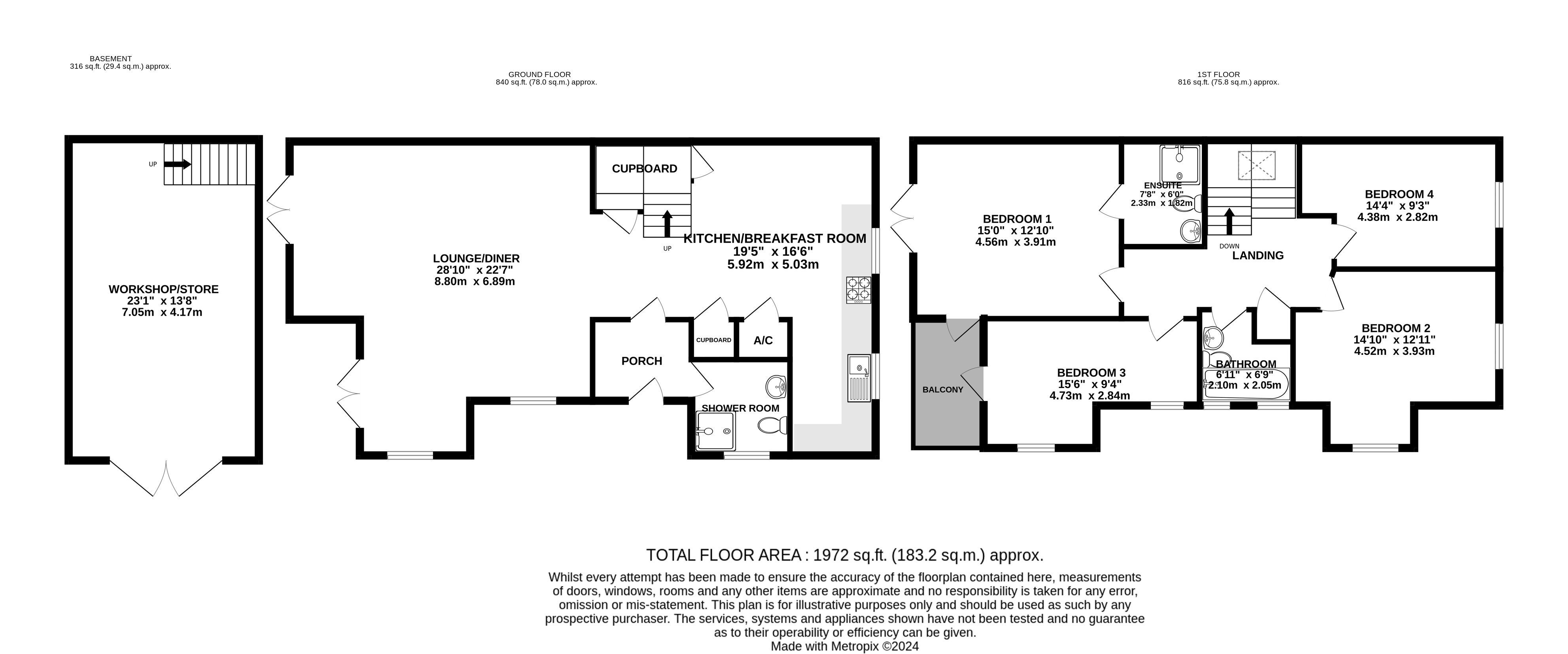 Ensuite 7'8" x 6' (2.34m x 1.83m).