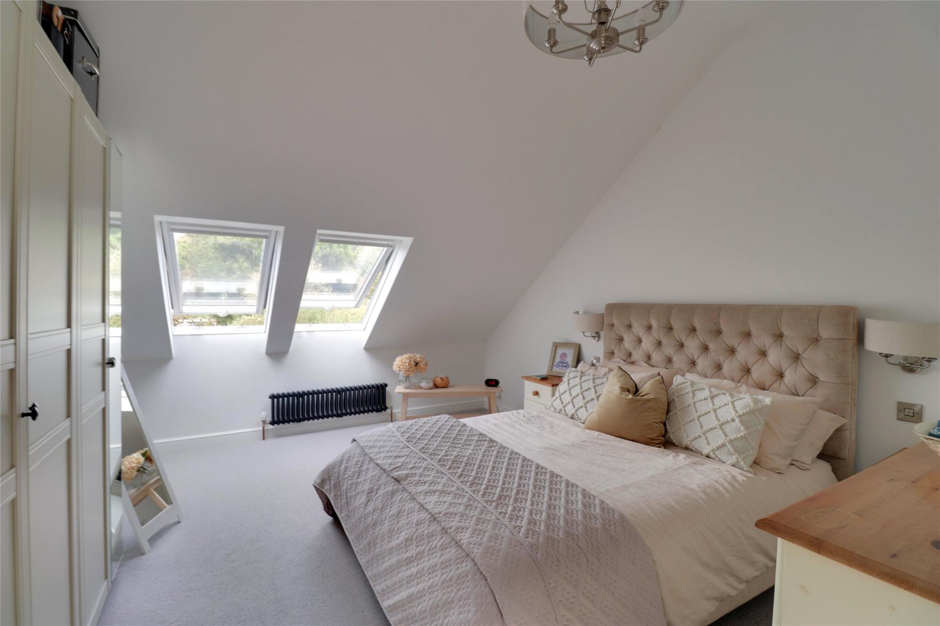 Upstairs, the accommodation includes four well-proportioned bedrooms. The principal bedroom is particularly impressive, offering a dedicated dressing area and a stylish en-suite shower room. Enjoying elevated views to the rear, it overlooks the garden and rolling hills beyond, providing a peaceful and private retreat.