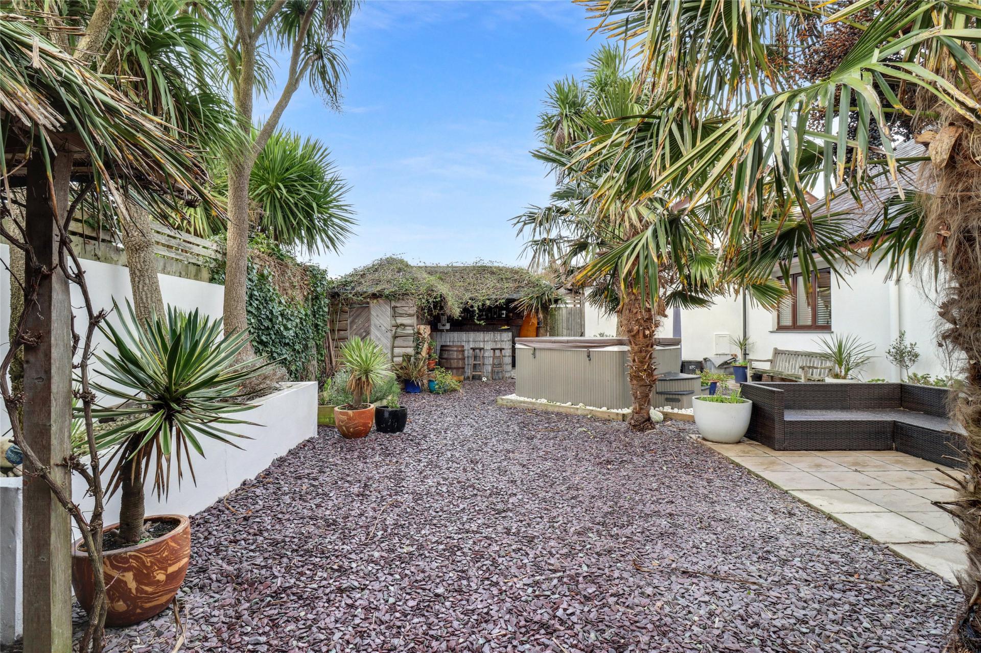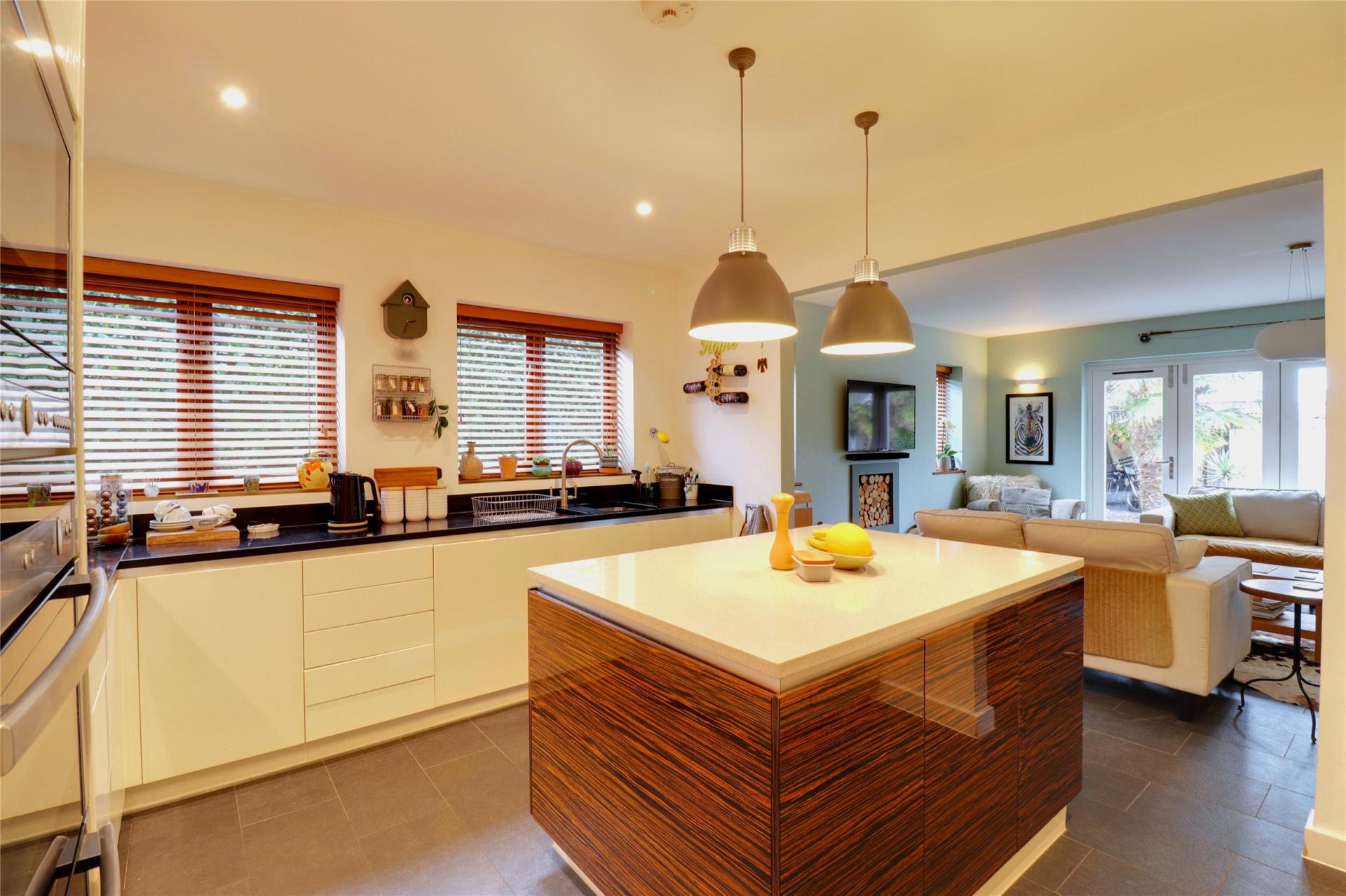 Externally, the property is approached via a shared access leading to a paved driveway and chipped area providing parking for three vehicles, including space suitable for a motorhome. There is also a garage and side access to the rear garden. The rear garden is low-maintenance and perfectly designed for entertaining, featuring a large patio, bar area, storage and a sheltered space ideal for outdoor cooking and socialising.