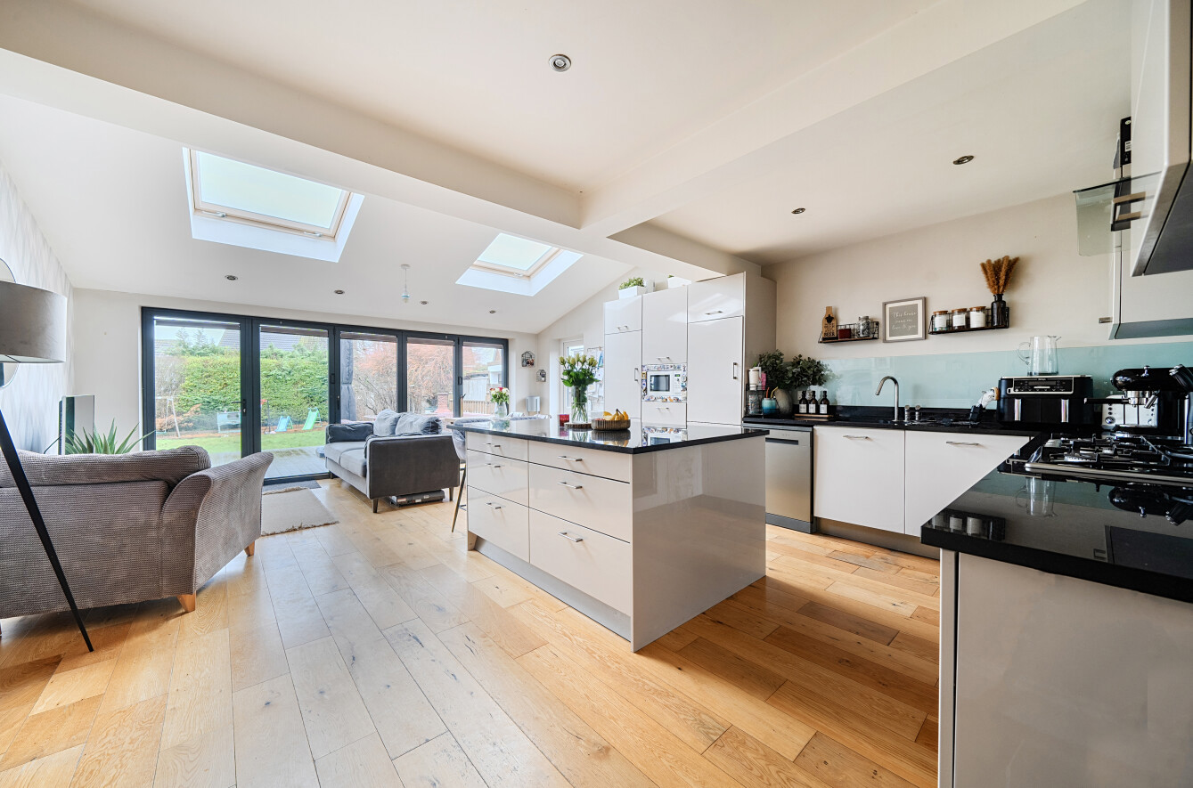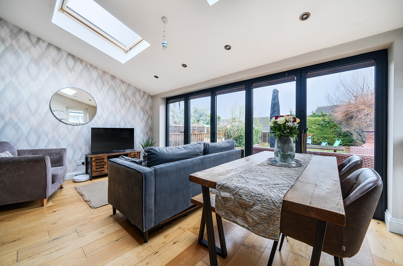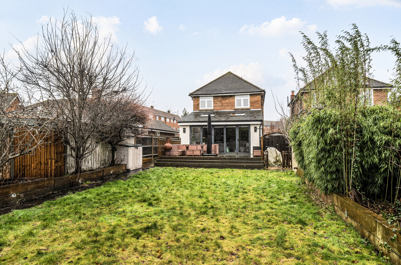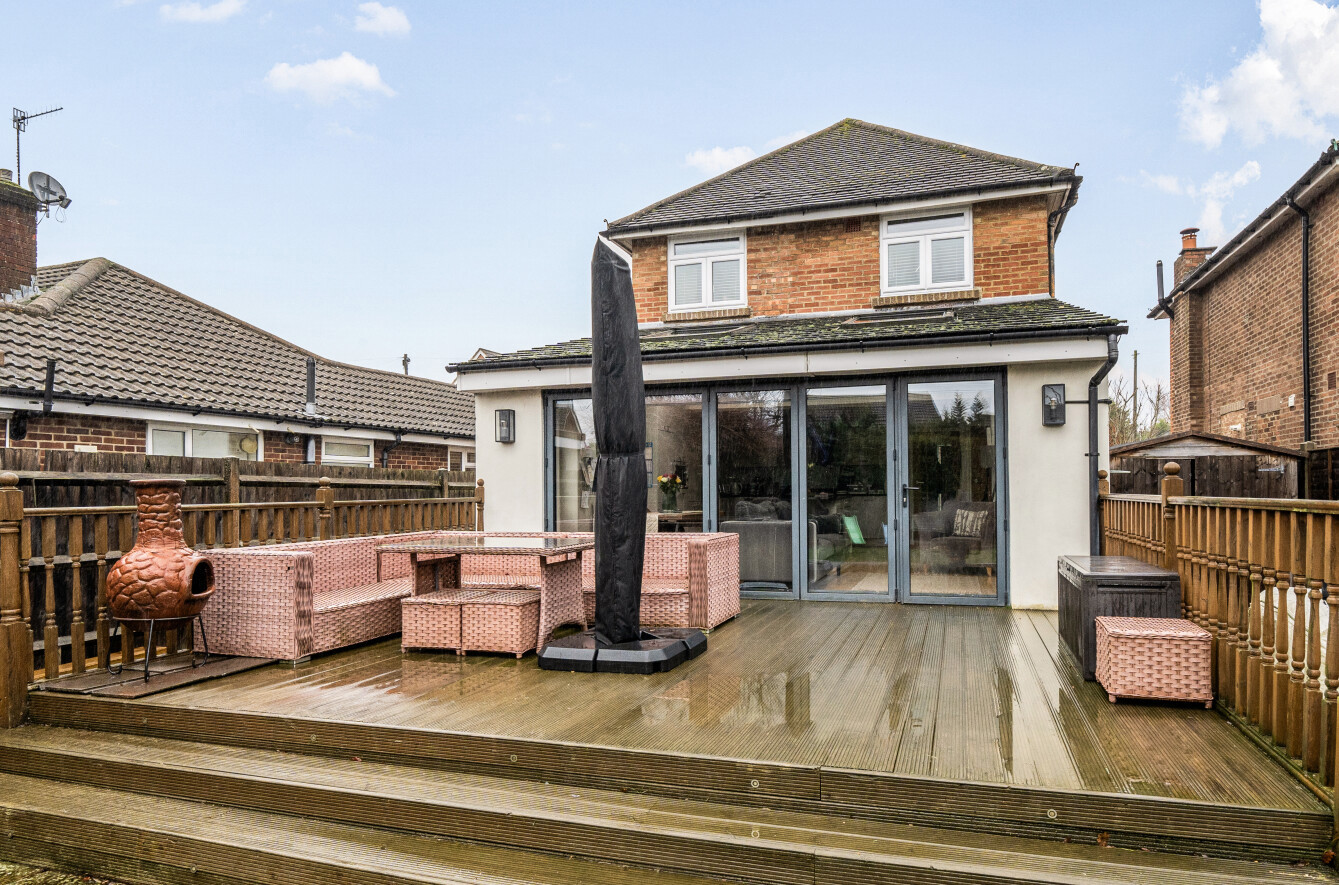 Set within the popular Fairlands area of Guildford, this attractive three bedroom detached home offers beautifully presented accommodation with a contemporary finish throughout, ideal for families and those seeking a turnkey property. The house combines classic kerb appeal with a modernised interior, featuring a welcoming frontage with generous driveway parking and a practical layout that flows perfectly for everyday living.A central hallway provides a warm introduction to the home, with clever storage solutions that make excellent use of space and help keep day-to-day life organised. Off the hallway is a separate living room, creating a cosy retreat away from the main entertaining space, complete with a log burner that brings character and comfort, perfect for relaxing evenings in.To the rear, the property opens into an impressive kitchen and dining space that has been finished to an immaculate standard. The kitchen is both stylish and highly functional, with sleek cabinetry, quality work surfaces and a central island providing a natural hub for cooking and entertaining. A dedicated cupboard neatly houses the white goods, keeping the main space clean and uncluttered, while wide bi-fold doors and roof lights flood the room with natural light and create a seamless connection to the garden. A ground floor WC adds further practicality, ideal for guests and busy family life.Upstairs, the first floor offers three well-proportioned bedrooms, including a spacious main bedroom with an attractive bay window. Bedroom two is a generous double and enjoys a pleasant outlook over the rear garden, while the third bedroom provides an ideal child's room, nursery or home office. The bathroom has been updated within the last 12 months by the current owner and is beautifully appointed with a modern suite and contemporary finishes, giving a fresh, luxurious feel.Outside, the rear garden is a real highlight, with a generous lawn and a substantial raised decking area providing the perfect setting for outdoor dining, entertaining or relaxing in the warmer months. A useful outbuilding/shed offers excellent storage, and the property benefits from a degree of separation from neighbouring homes, enhancing privacy and also offering future potential to extend, subject to the usual consents.Fairlands is a highly regarded residential area on the north side of Guildford, well placed for a wide range of local amenities. Nearby you'll find excellent schooling options including popular local primary schools and well-regarded secondary schools, along with convenient access to shops, supermarkets and everyday services. The area also benefits from green open spaces and leisure facilities, while Guildford town centre offers a wider selection of shopping, restaurants and entertainment, together with a mainline station providing fast and frequent services into London.