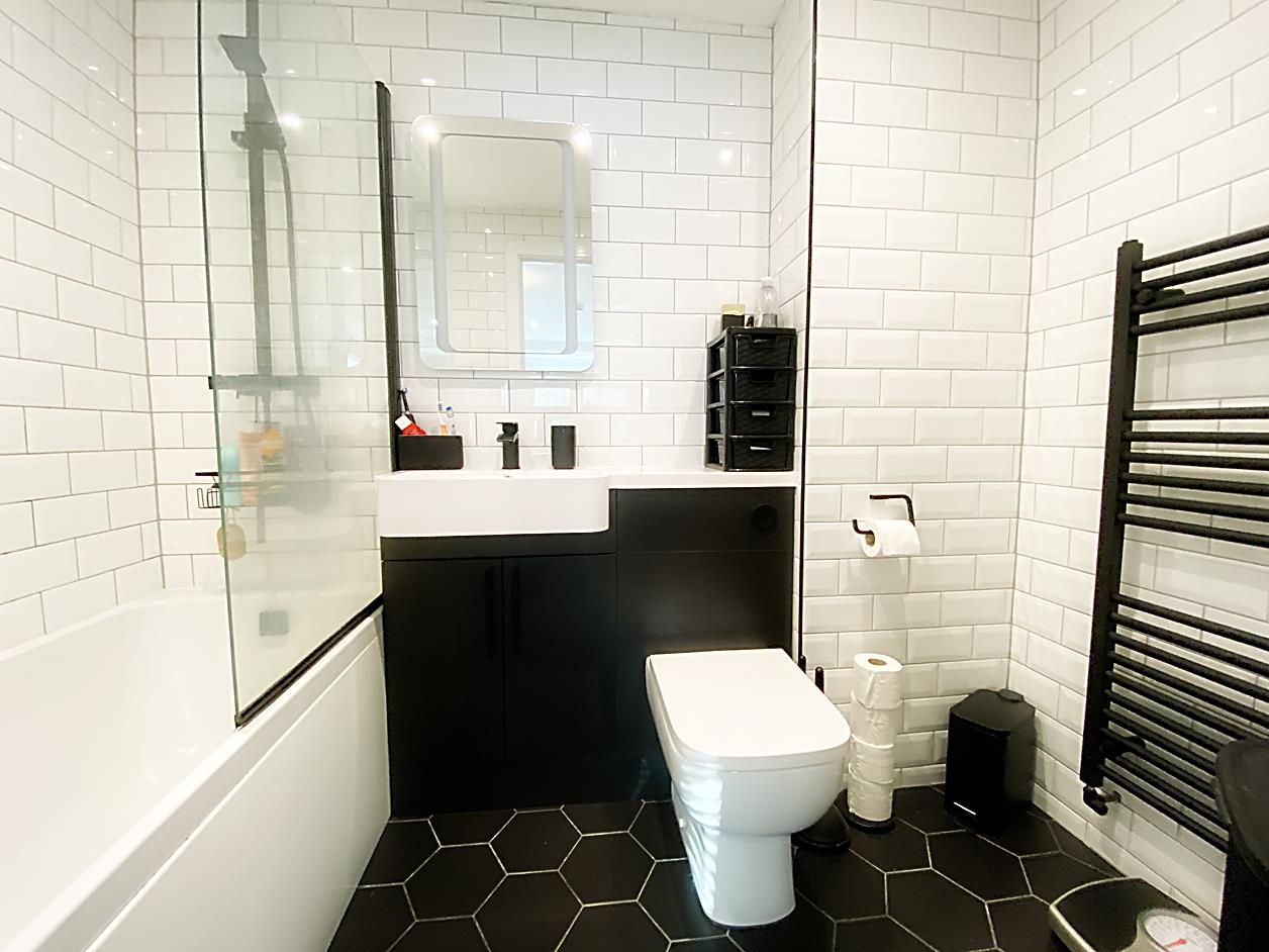 Bathroom - 2.25 x 1.64 - Comprising; bath with shower over, WC and wash hand basin with built-in furniture surrounding. Tiling to walls, double glazed window and ladder style radiator.
