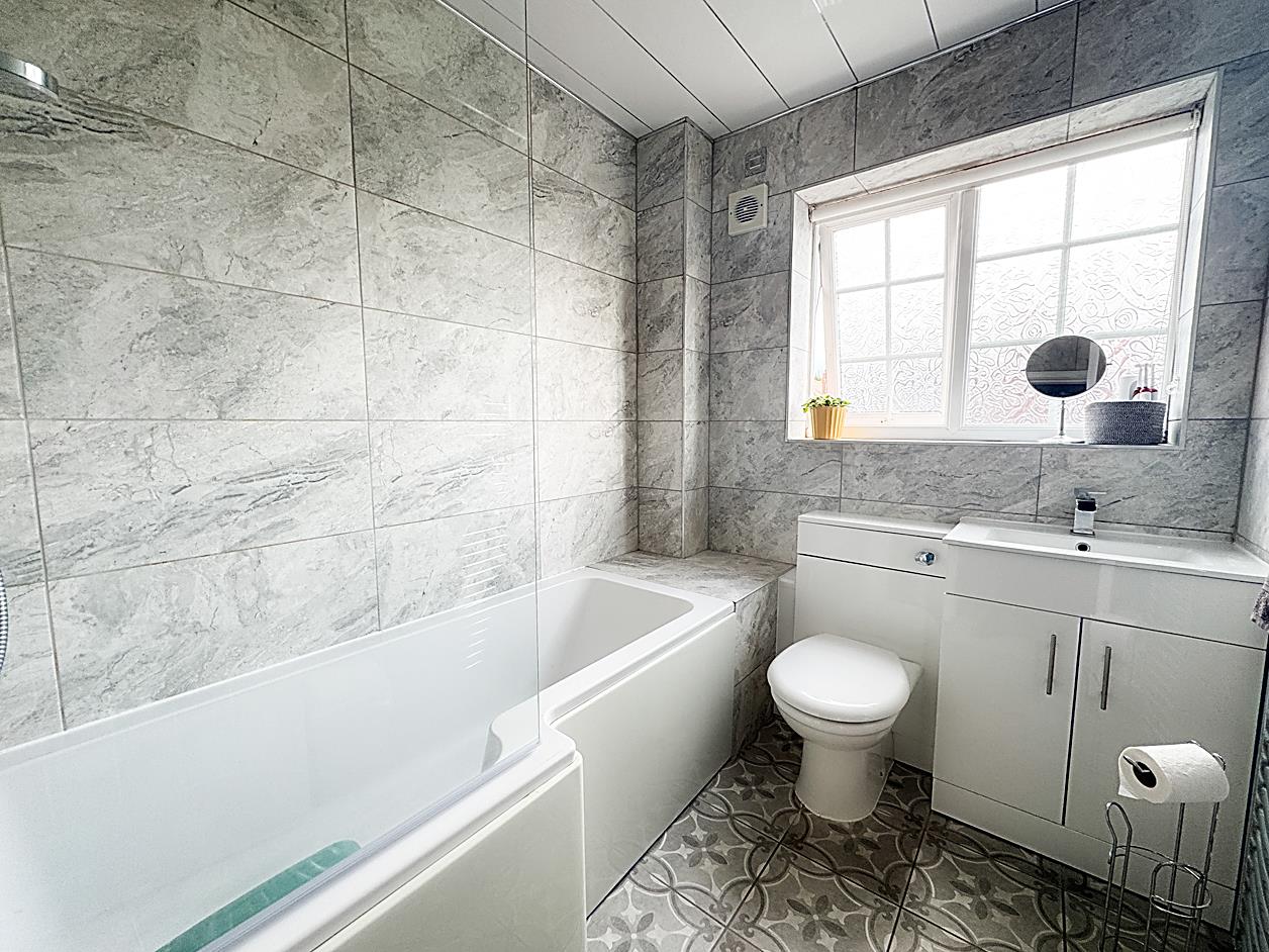 Bathroom - 2.51 x 1.88 - Fitted with bath with overhead shower , WC, wash hand basin with built-under storage. Double glazed window, tiling to walls and floor, ladder style radiator.