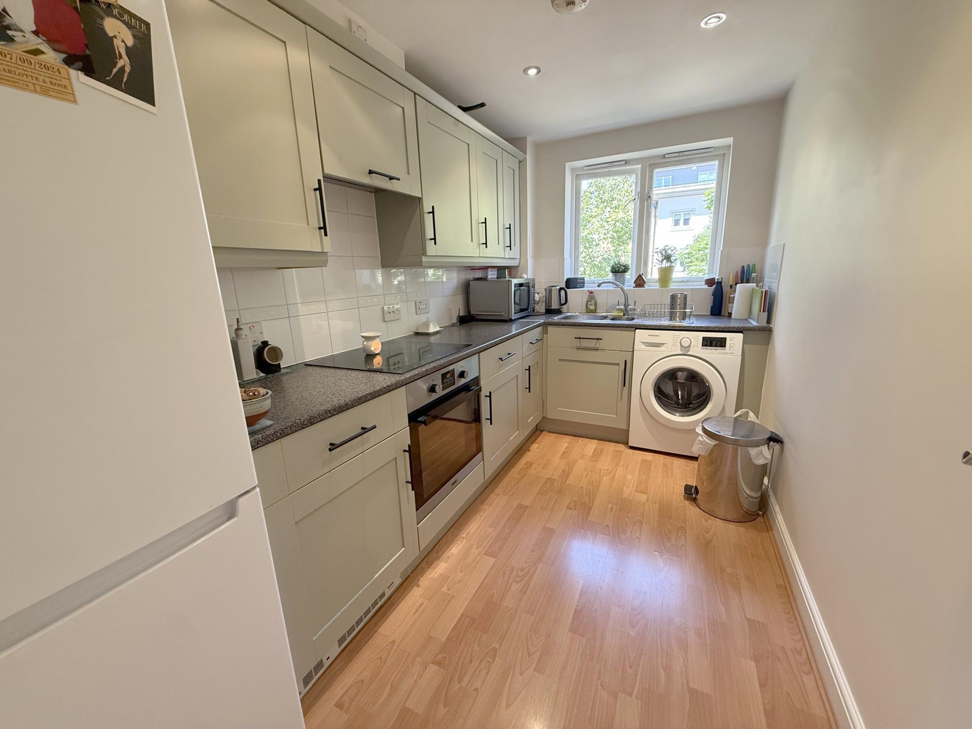 Double glazed window to side, recessed spotlighting, smoke detector, worktops with a range of matching wall & base units, 1 1/2 bowl stainless steel inset sink unit with mixer taps, part tiled walls, electric hob with cooker hood above, electric oven & grill below, space & plumbing for washing machine and tall fridge/freezer, light wood effect flooring, power points.