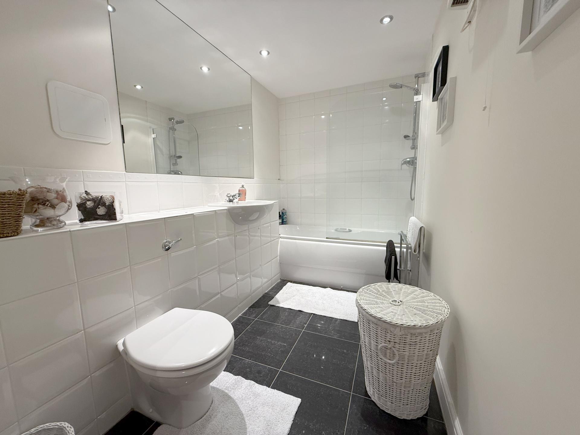 White suite comprising low level w.c with concealed cistern, wash hand basin, wall mirror, panel enclosed bath with mixer taps and wall mounted thermostatic shower, glass shower screen, part tiled walls, extractor fan, wall mounted heater, tiled flooring, recessed spotlighting.