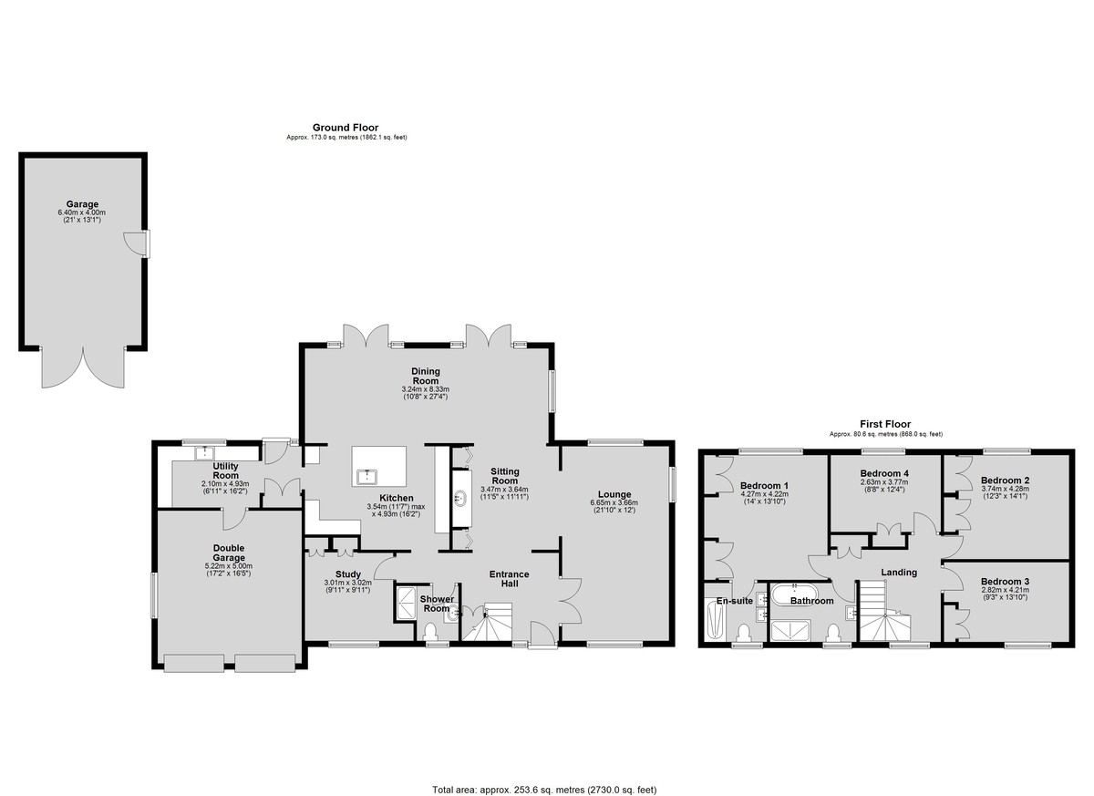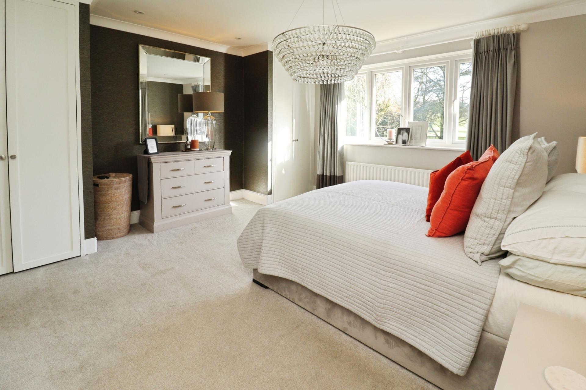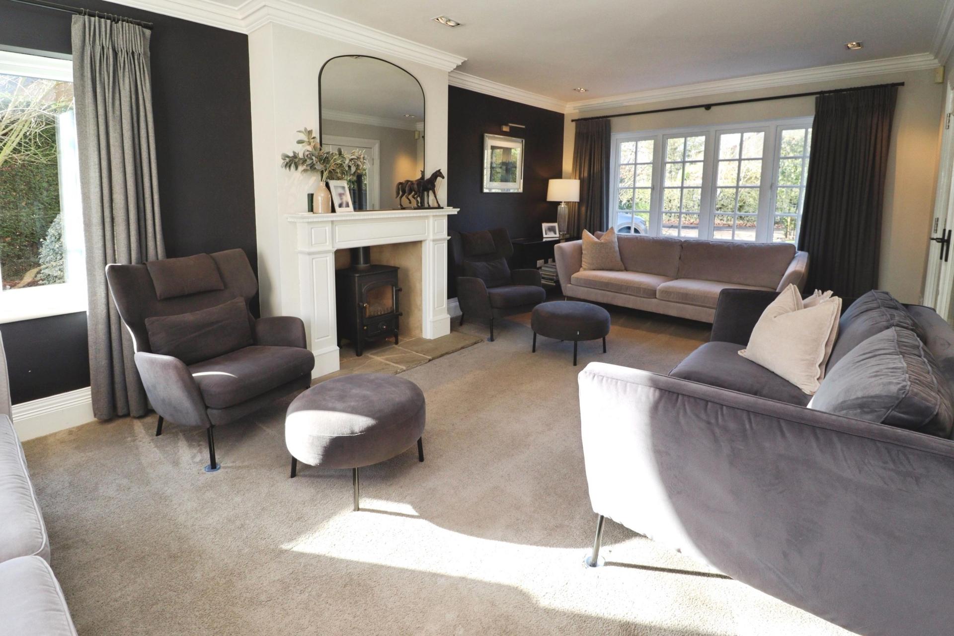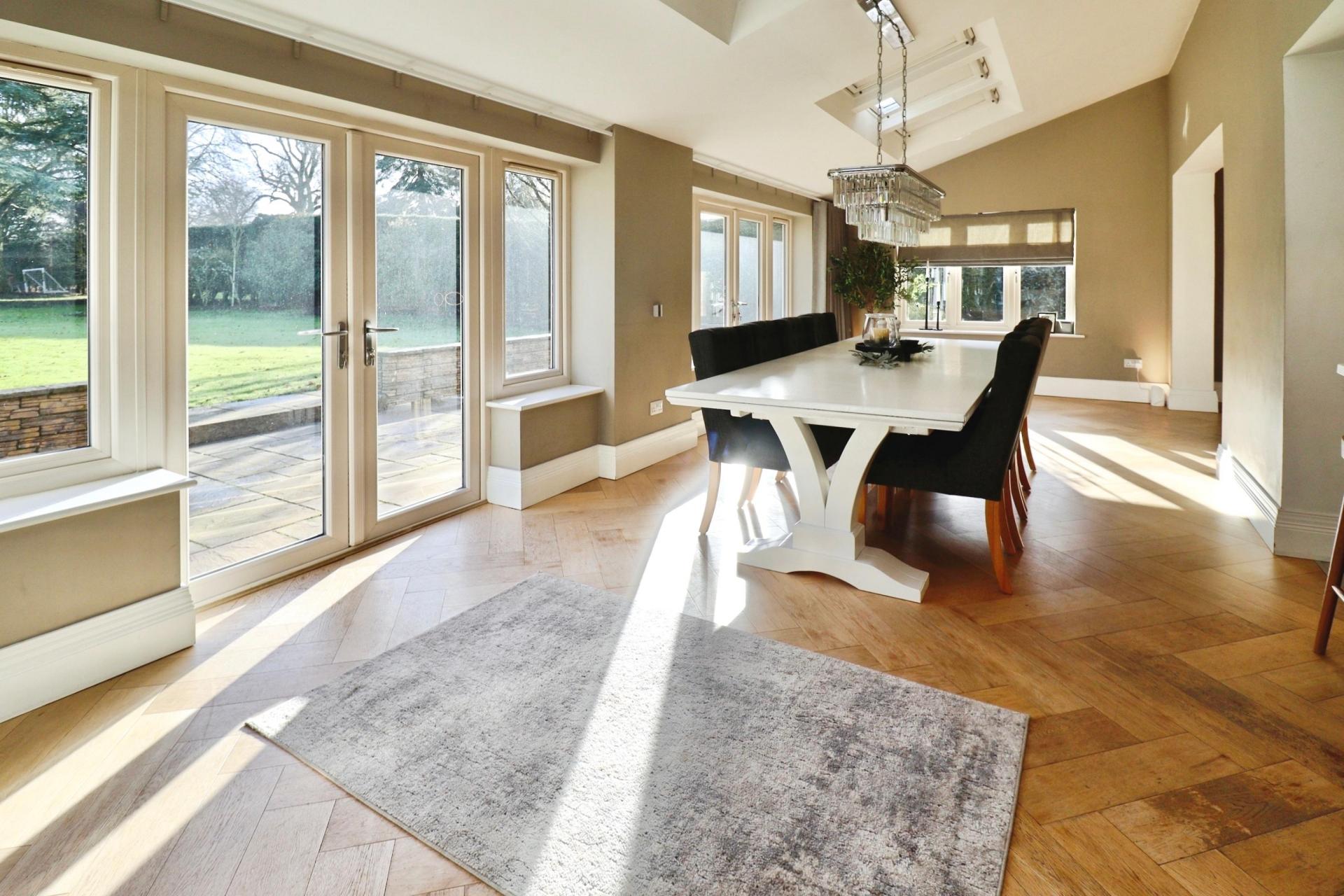 OUTSIDE To the front of the property is a sweeping "in and out" gated gravelled driveway, offering extensive off street parking for numerous vehicles and providing access to the integral double garage. An additional driveway to the side leads to a further single detached garage, while the frontage is beautifully framed by an expansive lawned garden adorned with mature shrubs and established trees, creating an impressive sense of arrival.