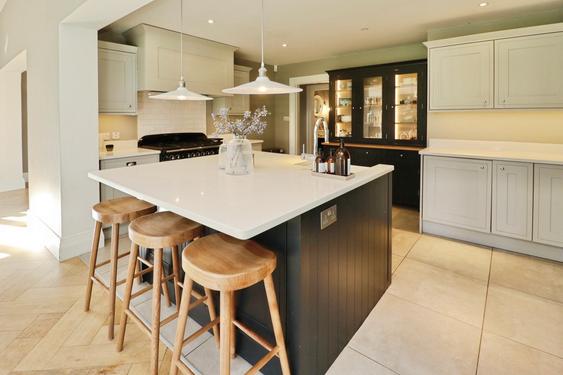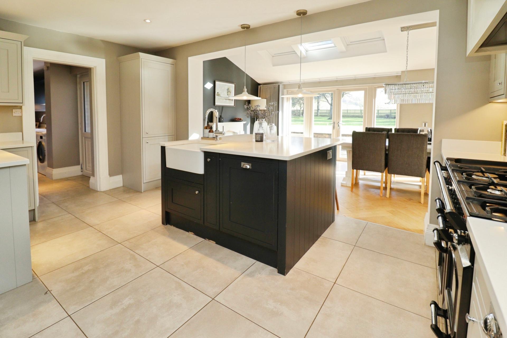 KITCHEN 16' 2" x 11' 7" (4.93m x 3.54m) Fitted with a modern range of wall and base units with complementary work surfaces, the kitchen features a central island with breakfast bar and downlighters, creating a practical and sociable focal point and incorporating a ceramic Belfast sink with side drainer and mixer tap, integrated appliances include a fridge and dishwasher, space for a Range style cooker complemented by tiled splashbacks, spotlights, under cabinet lighting and kickboard lighting enhance the ambience, while attractive tiled flooring completes the room.