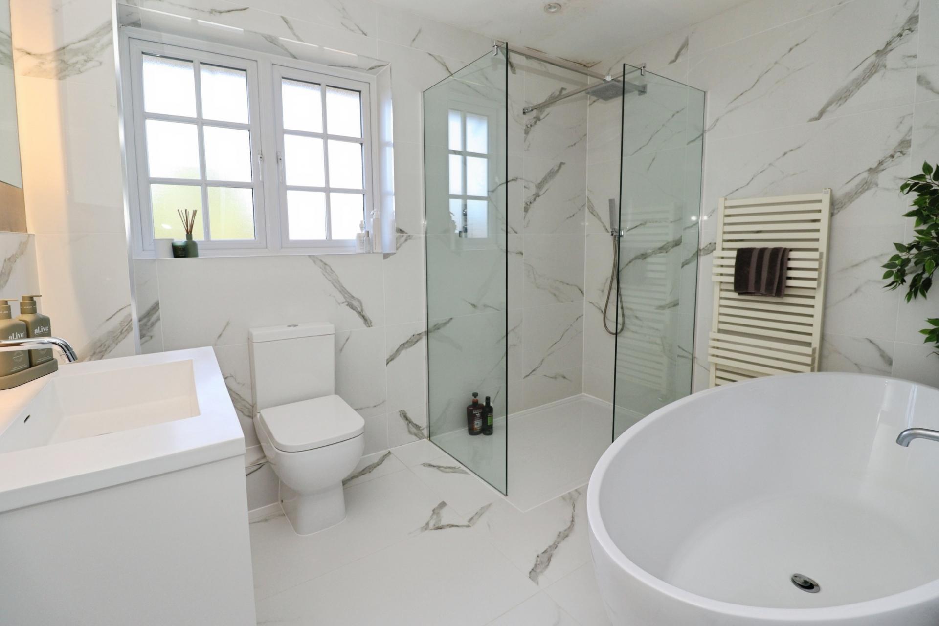 BATHROOM Refitted with a luxurious suite comprising of freestanding bath tub with floor lighting, walk-in shower cubicle with rainfall shower, close coupled WC and wash hand basin, part tiled walls, tiled flooring, towel radiator, spotlights and double glazed window to the front aspect.