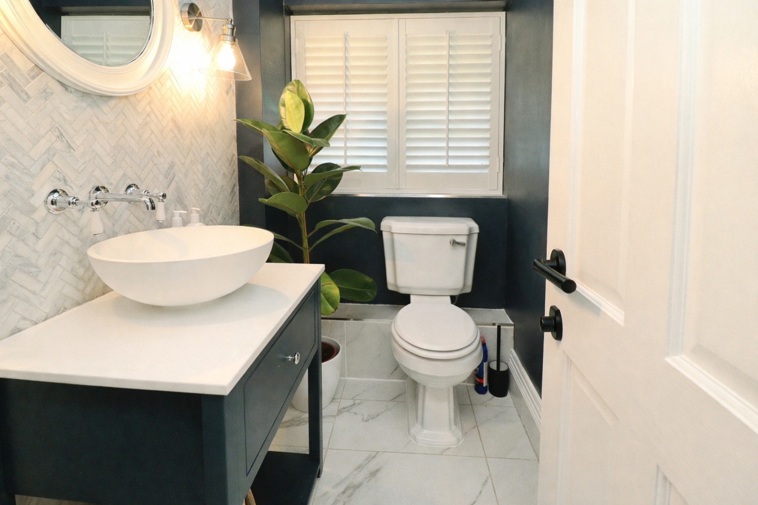 SHOWER ROOM 6' 11" x 6' 2" (2.13m x 1.88m) Refitted with a stylish three piece suite comprising of walk-in shower cubicle with rainfall shower, close coupled WC and wash hand basin on a vanity stand, tiled flooring and splashbacks, radiator, spotlights, wall lights and double glazed window to the front aspect.