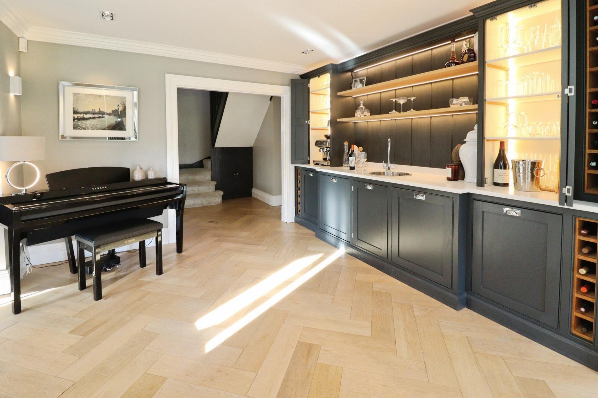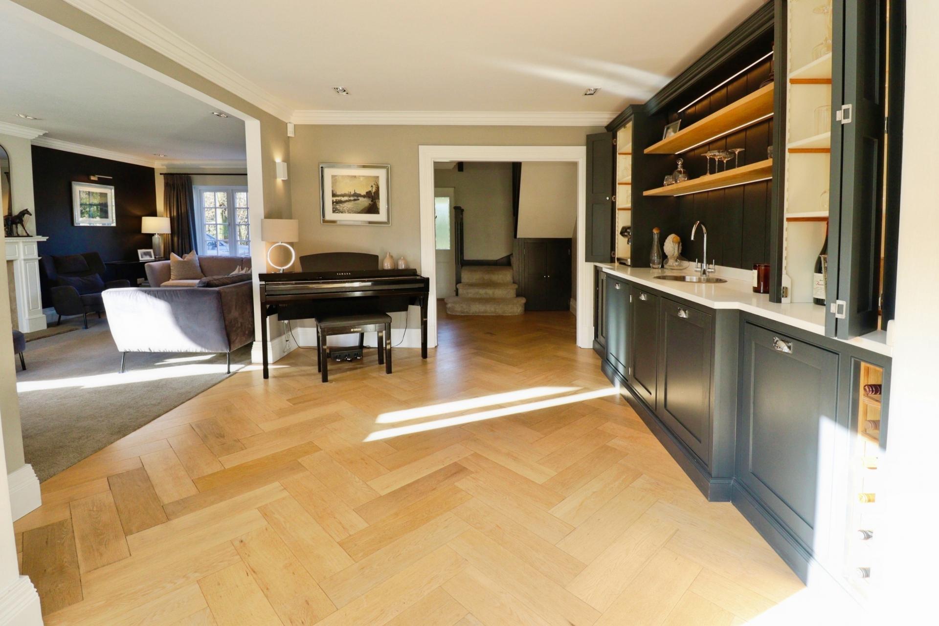 SITTING ROOM 11' 11" x 11' 4" (3.64m x 3.47m) Featuring a stylish built-in bar with storage cupboards and illuminated shelving, a stainless steel bowl sink with mixer tap over, space for integrated dishwasher, elegant wooden parquet flooring and recessed spotlights.