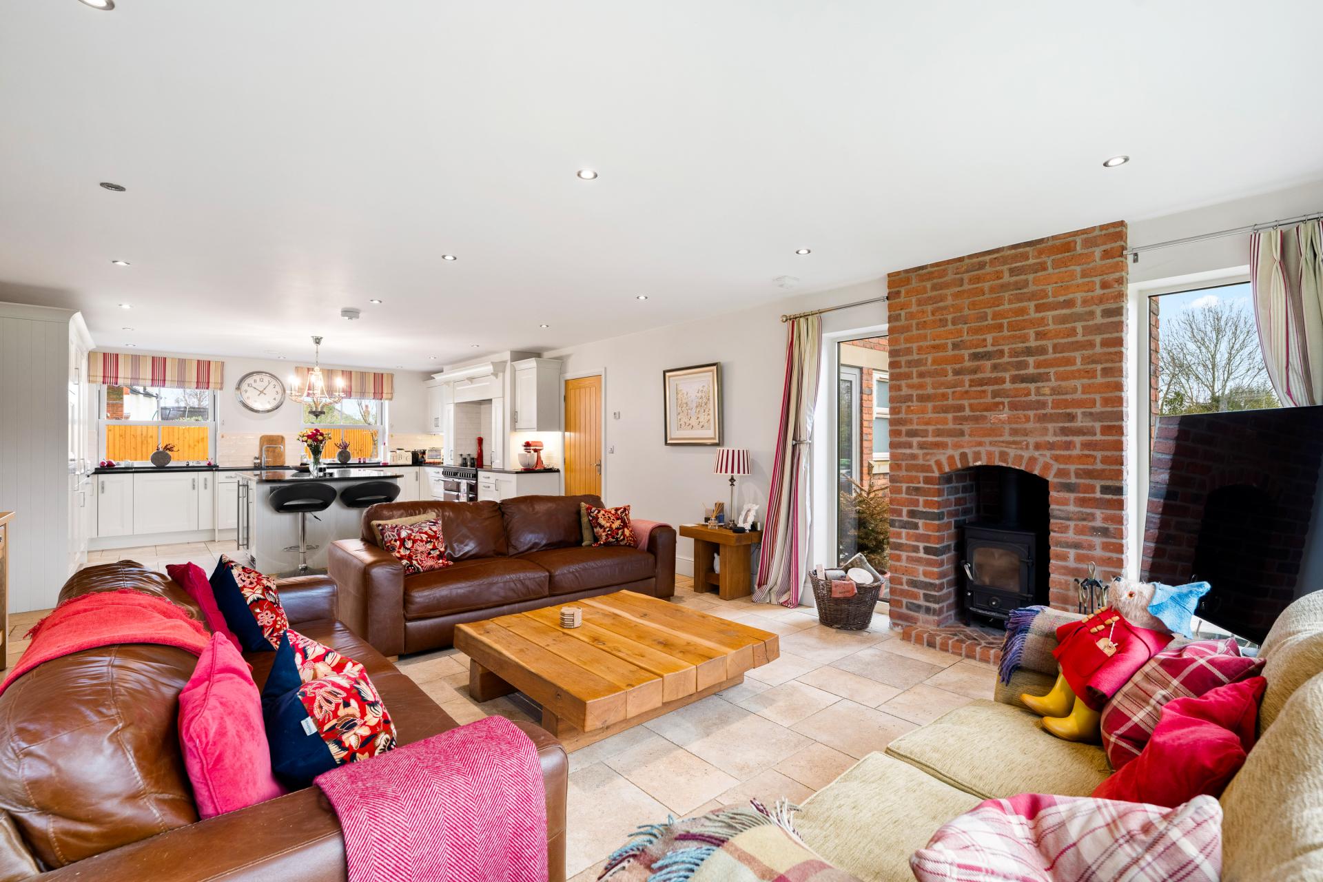 The living area boasts a charming log burner set within a brick fireplace and continues the tiled flooring with underfloor heating throughout. Natural light floods the room through three double glazed windows to the side aspects, while double glazed bi-fold doors open seamlessly onto the rear garden, creating a perfect blend of indoor and outdoor living.