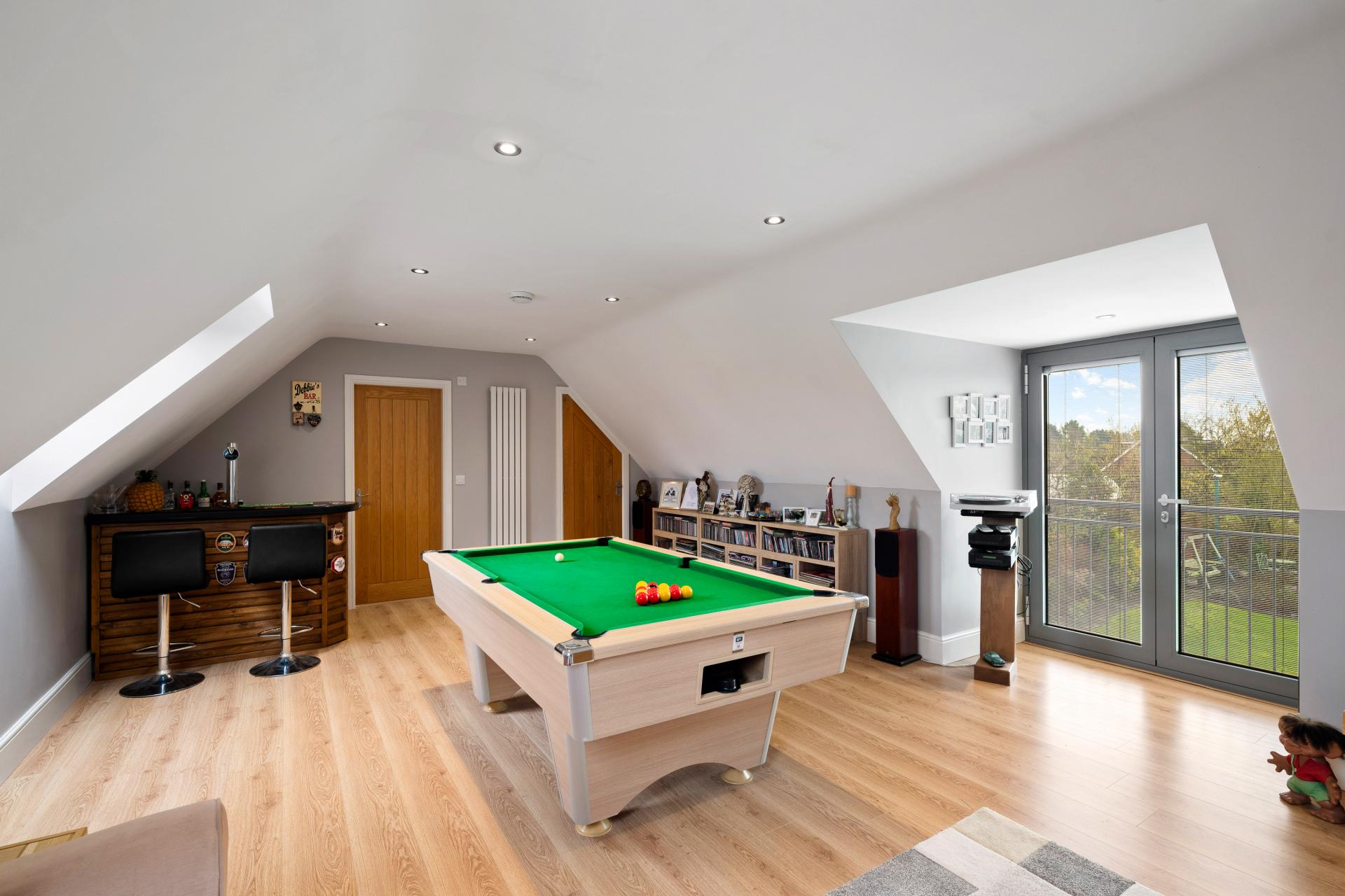 GAMES ROOM / BEDROOM 5 21' 7" x 14' 9" (6.60m x 4.50m) A spacious and versatile room featuring a double glazed Juliet balcony with views over the rear garden, three Velux windows flooding the space with natural light, a generous storage cupboard, wood effect flooring, spotlights and two radiators.
