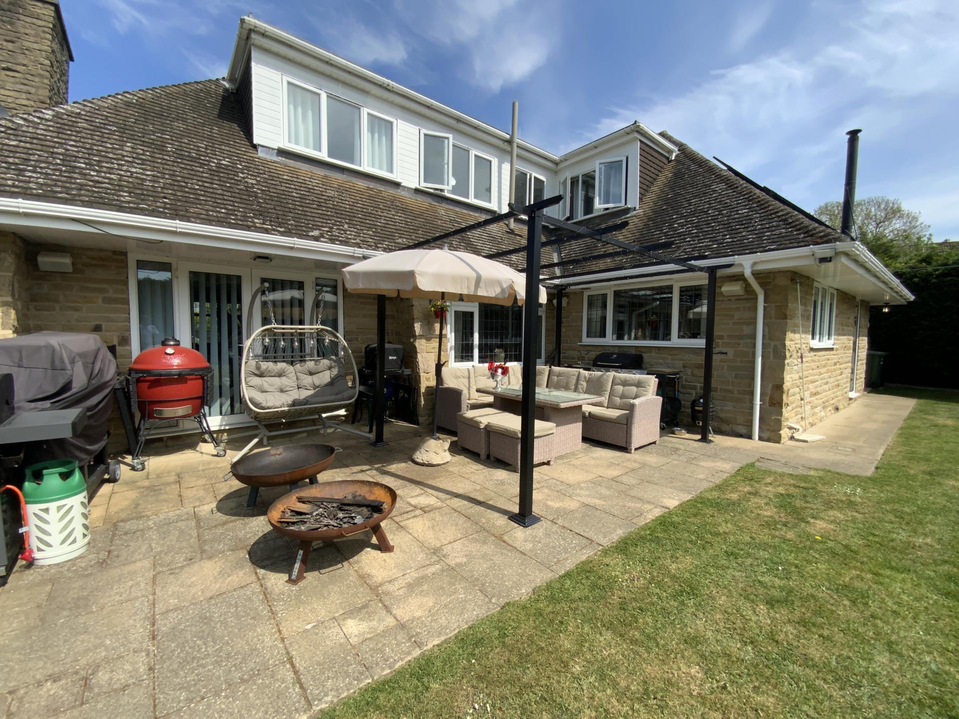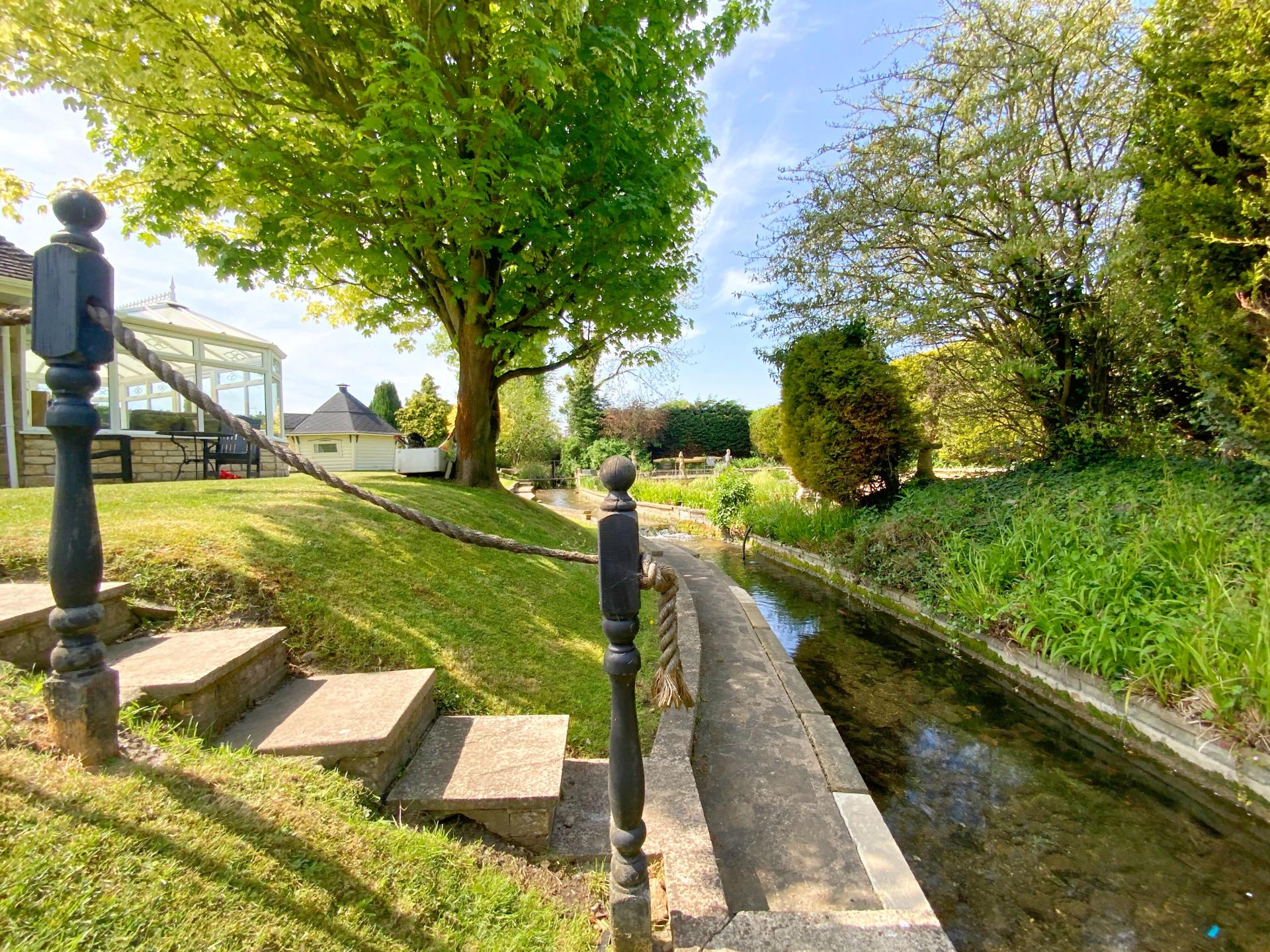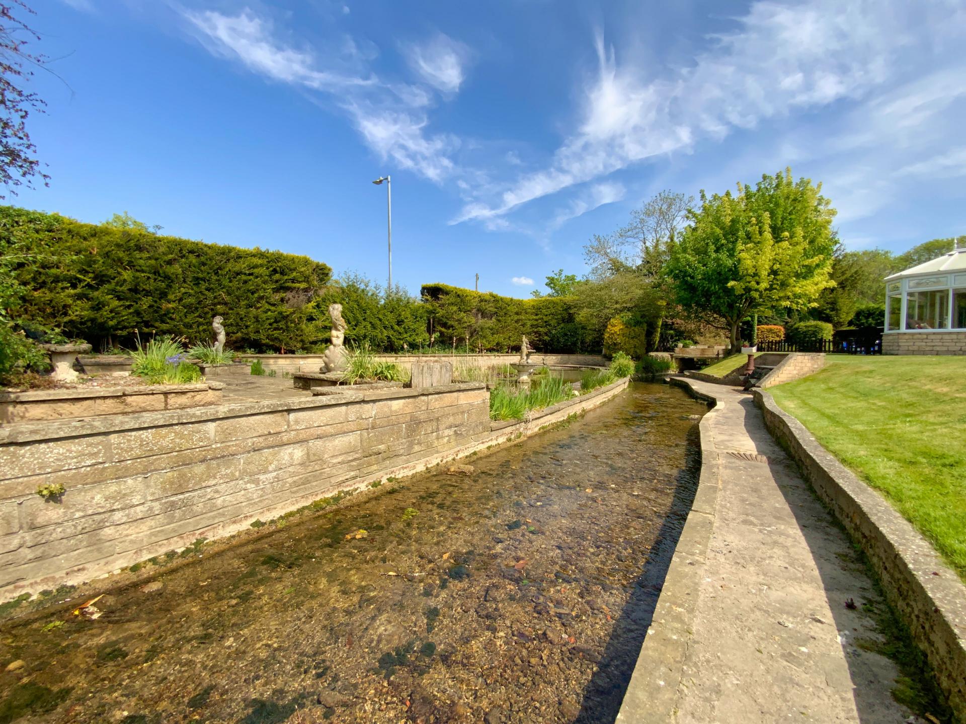 OUTSIDE To the front of the property there is a five-bar gated driveway giving access over the beck via a bridge to ample off street parking for multiple vehicles, a covered carport area, a lawned area with bin stores, lawned garden which slops down to a sunken pathway which walks adjacent to the beck with views over the beck and pond and a paved seating area. To the side and rear of the property there is an extensive lawned garden with mature shrubs and trees, a barbeque area/pizza hut, paved seating area with a covered pergola and a pool house with a full sized swimming pool.