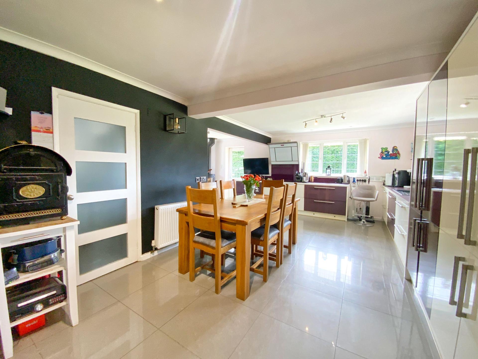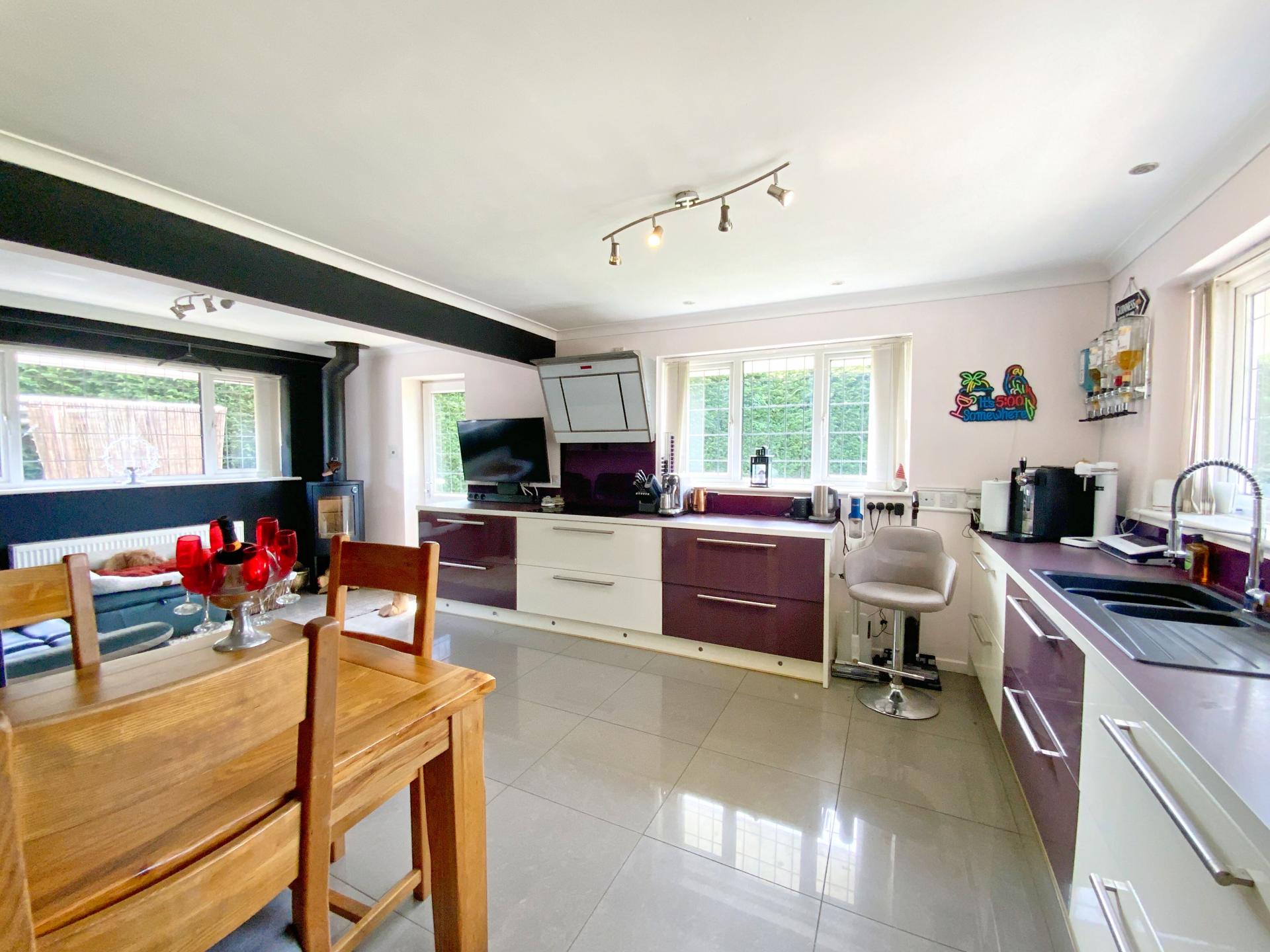KITCHEN/DINER 6' 19" x 6' 56" (2.31m x 3.25m) With feature tiled flooring, fitted with a range of modern base units and drawers with work surfaces over, composite sink and drainer with mixer tap, integral Neff induction hob with extraction above, integral double Neff oven and steam oven, integral fridge and freezer, wall mounted units with complementary splashbacks, space for dining table, log burner, UPVC leaded windows to the rear and side aspects and doors leading to utility room and garden.
