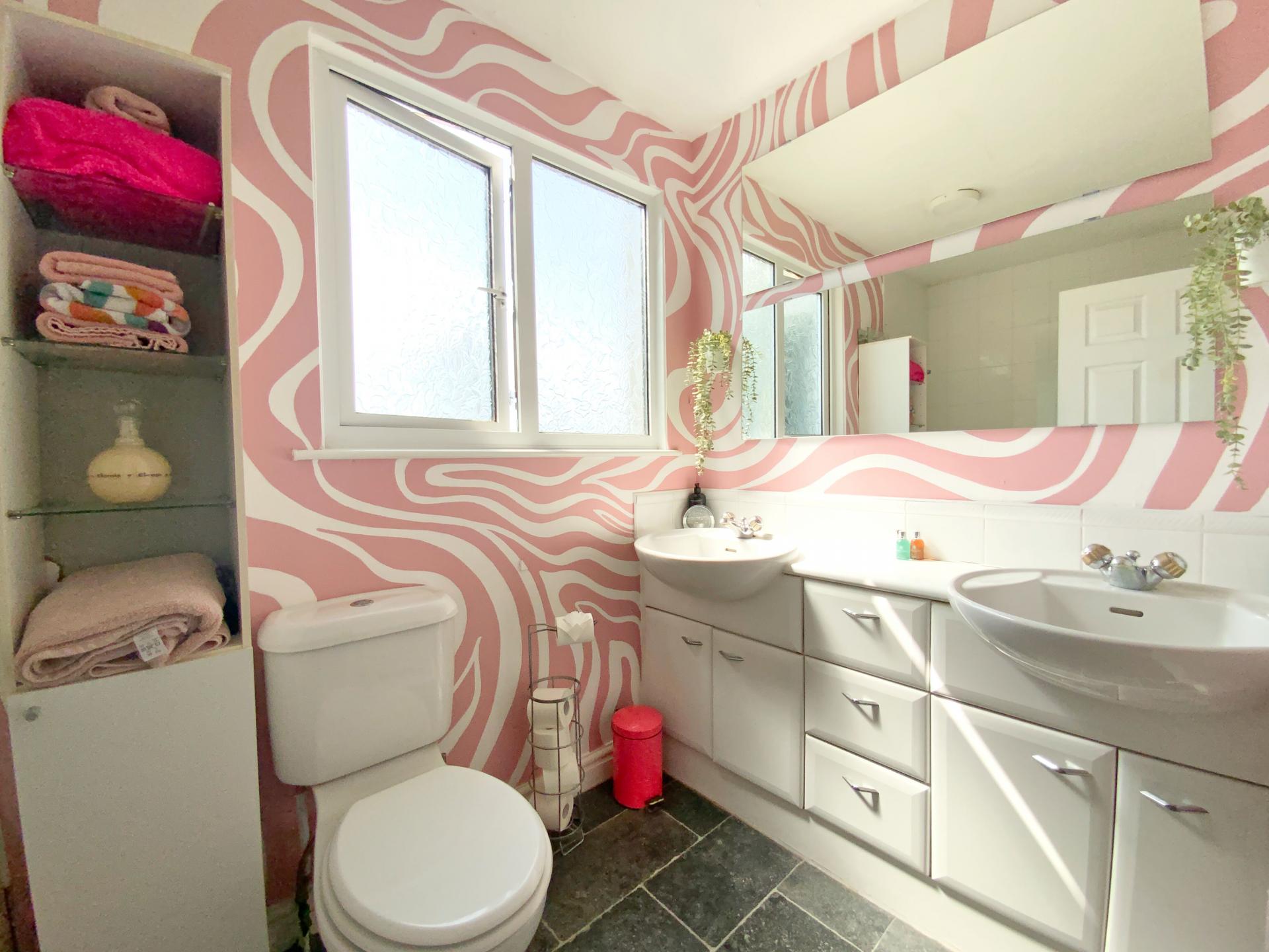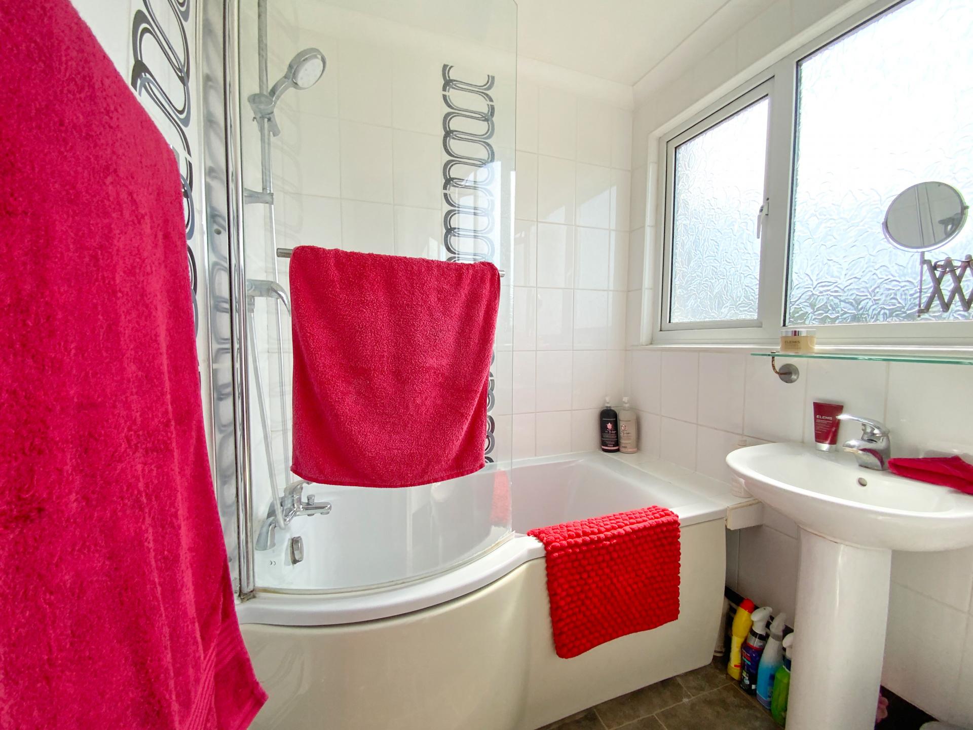 FAMILY BATHROOM 1' 79" x 2' 77" (2.31m x 2.57m) With UPVC window to the rear aspect, suite to comprise of bath with shower over, WC, his and hers wash hand basins with vanity cupboard, towel radiator and partly tiled walls.