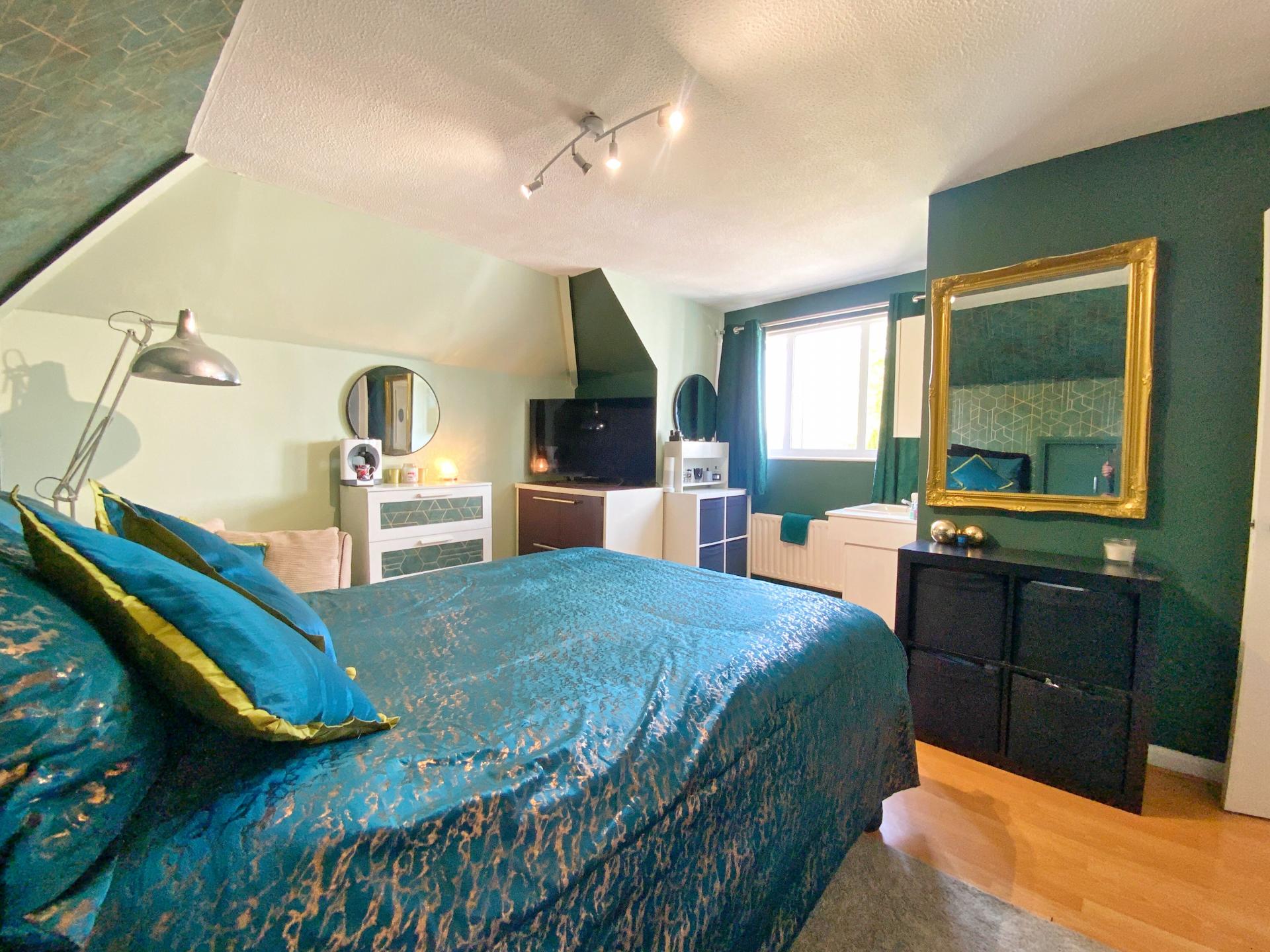 BEDROOM TWO 4' 70" x 4' 25" (3m x 1.85m) With walk-in UPVC dorma window with views over the garden, radiator, wooden laminate flooring, wash hand basin with vanity cupboard and loft storage area.