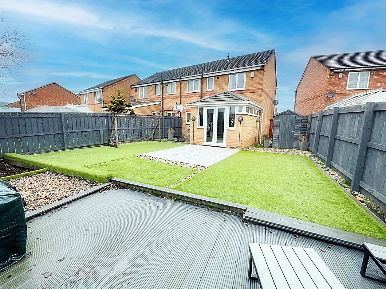 External - To the front of the property there is lawned area with side gated access to rear. To the rear the proper benefits from a south facing rear garden, patio area, decked area and lawn.