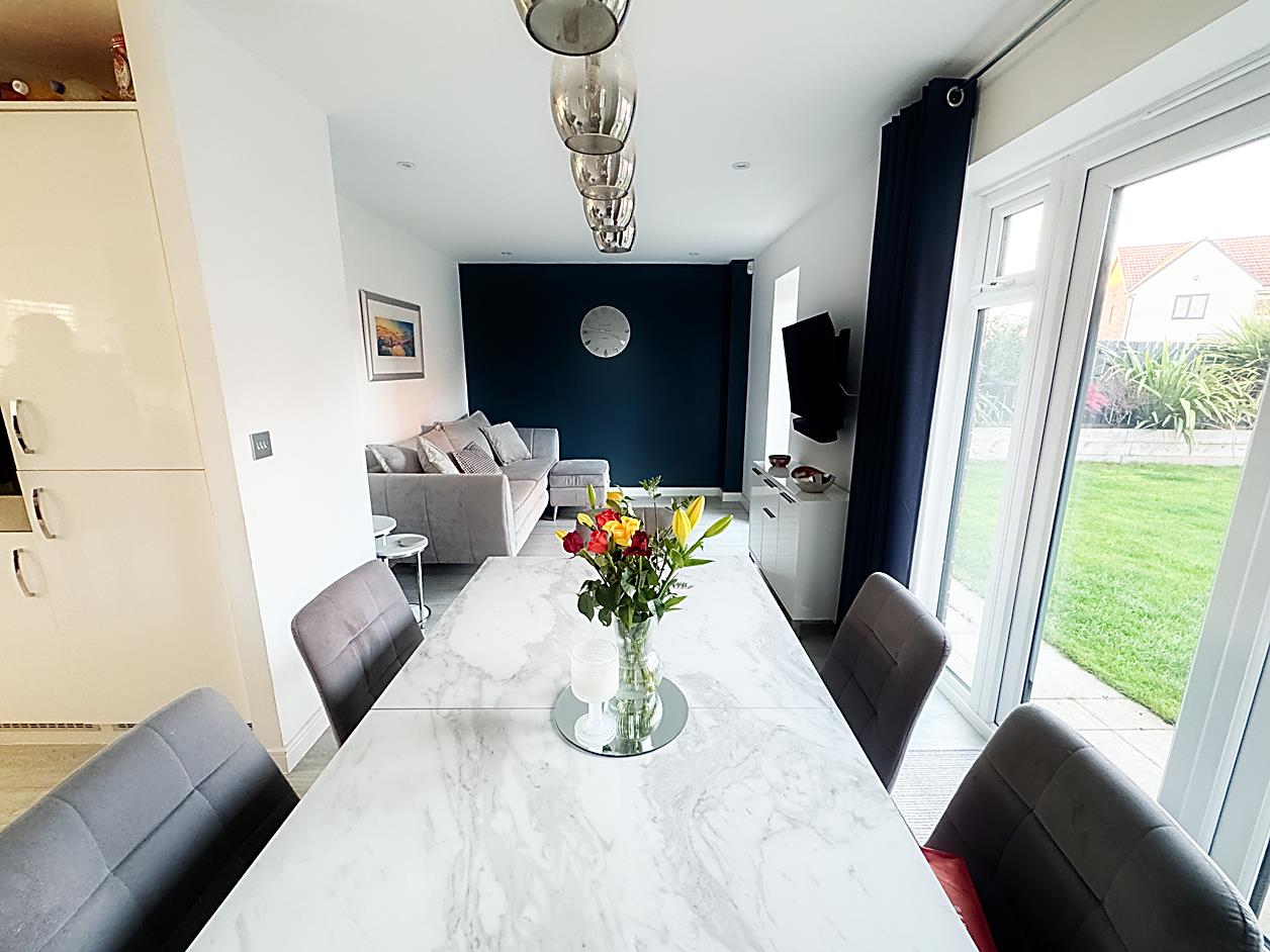 Kitchen/Diner - 6.05 x 2.67 x 5.87 (19'10" x 8'9" x 19'3") - Kitchen area fitted with a modern range of wall and base units with contrasting work surfaces over, integrated oven and hob with extractor hood over, sink unit, integrated fridge freezer, dishwasher and washing machine. Double glazed window, double glazed French doors leading out to the rear garden, radiator. Open plan to dining area.