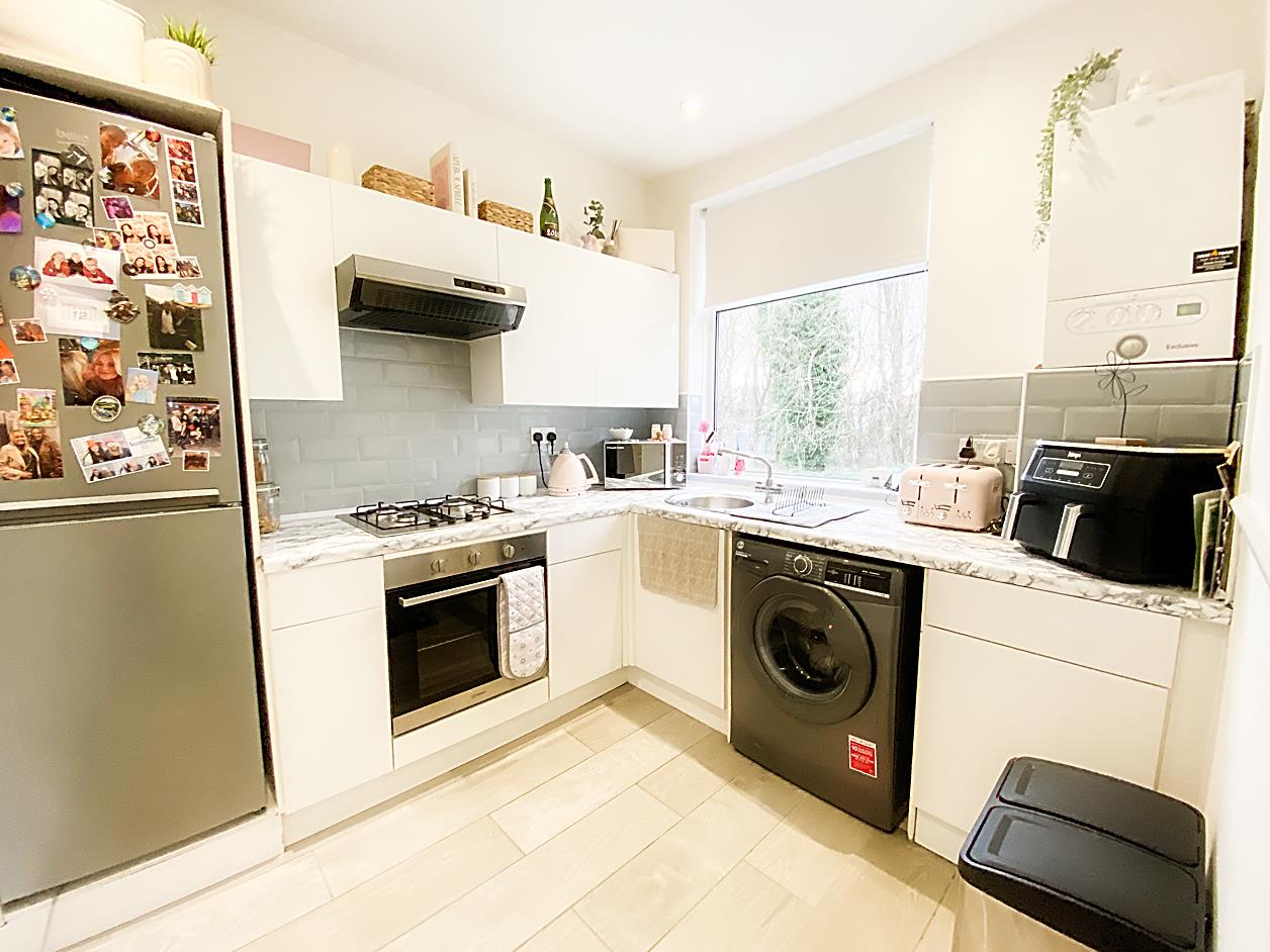Kitchen - 2.64 x 2.37 min (8'7" x 7'9" min) - Fitted with wall and base units with work surfaces over, sink unit and integrated oven and hob, double glazed window, radiator.