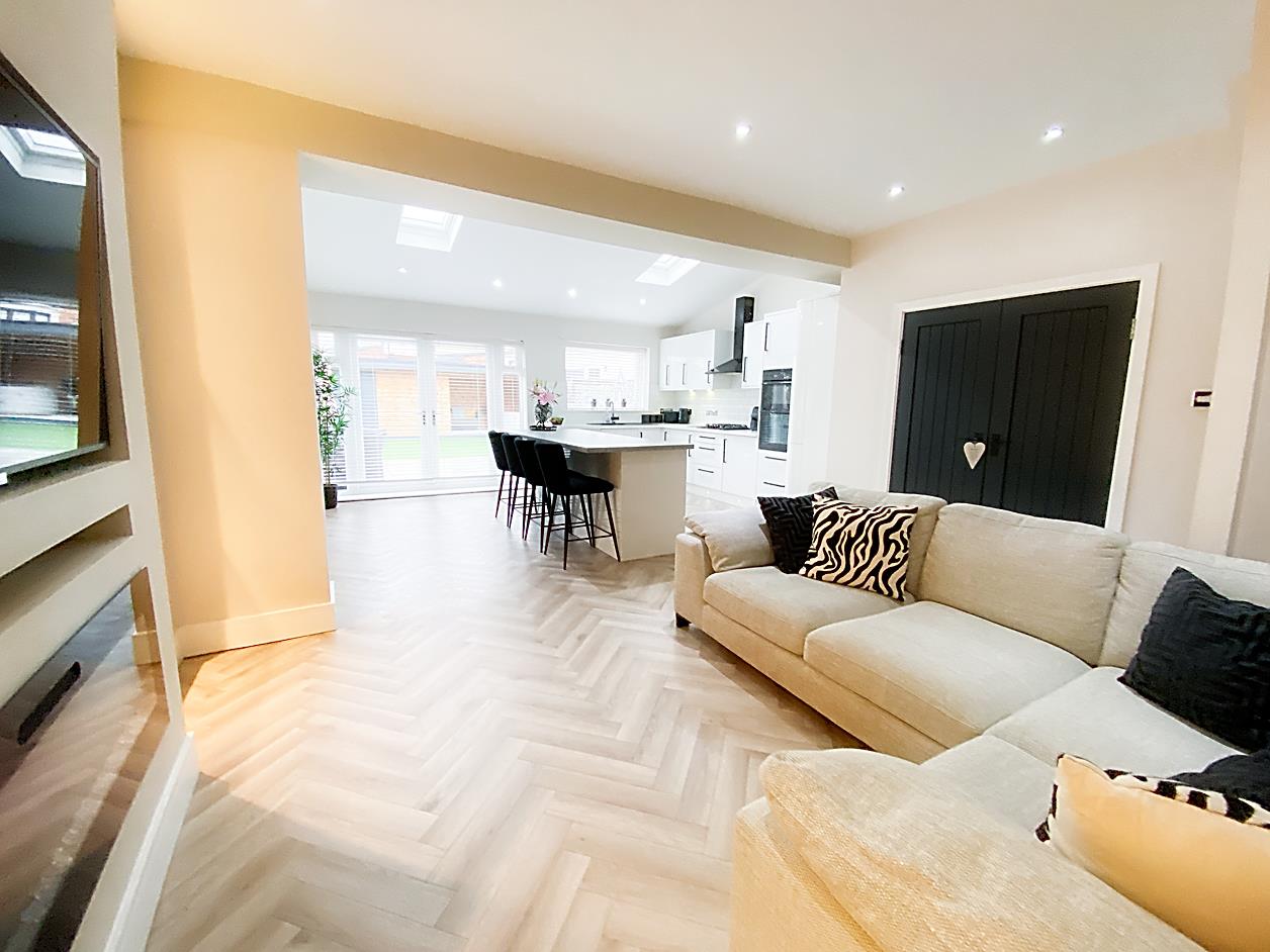 Kitchen Area - Fitted with a range of wall and base units with contrasting work surfaces over and central island, integrated oven and hob with extractor hood over, integrated dishwasher, fridge and freezer, sink unit. Double glazed window, radiator, wood effect herringbone flooring, two skylight windows and double glazed French doors leading out to the rear garden.