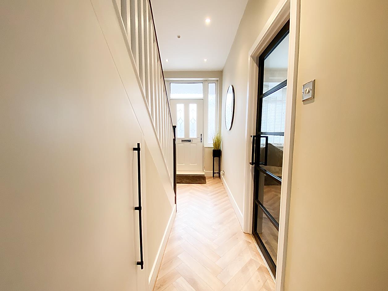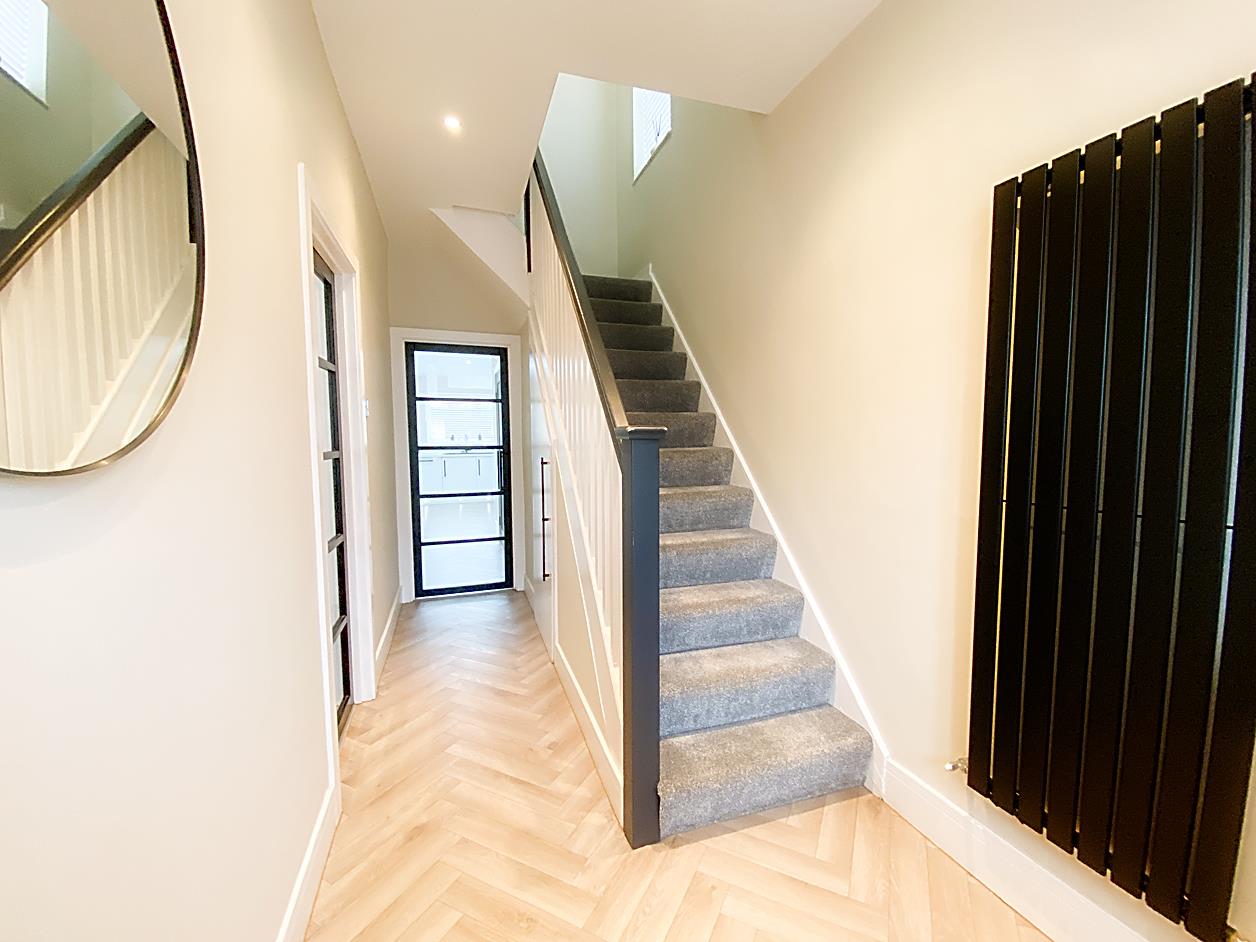 Hallway - Double glazed composite entrance door, wood effect herringbone flooring, stairs to the first floor landing with storage cupboard under, vertical radiator.