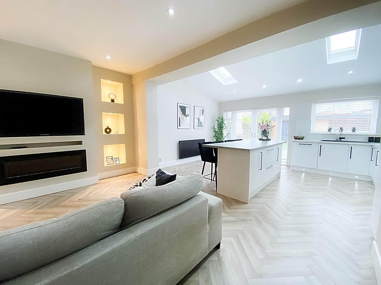 Living Area - 4.94 x 3.63 (16'2" x 11'10") - Feature media wall with living flame effect inset fire and lighting, vertical radiator, wood effect herringbone flooring. Open plan to kitchen area.