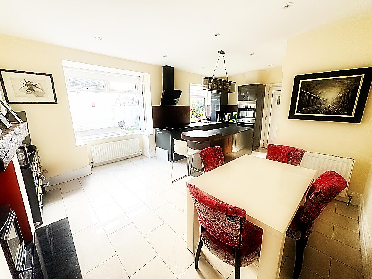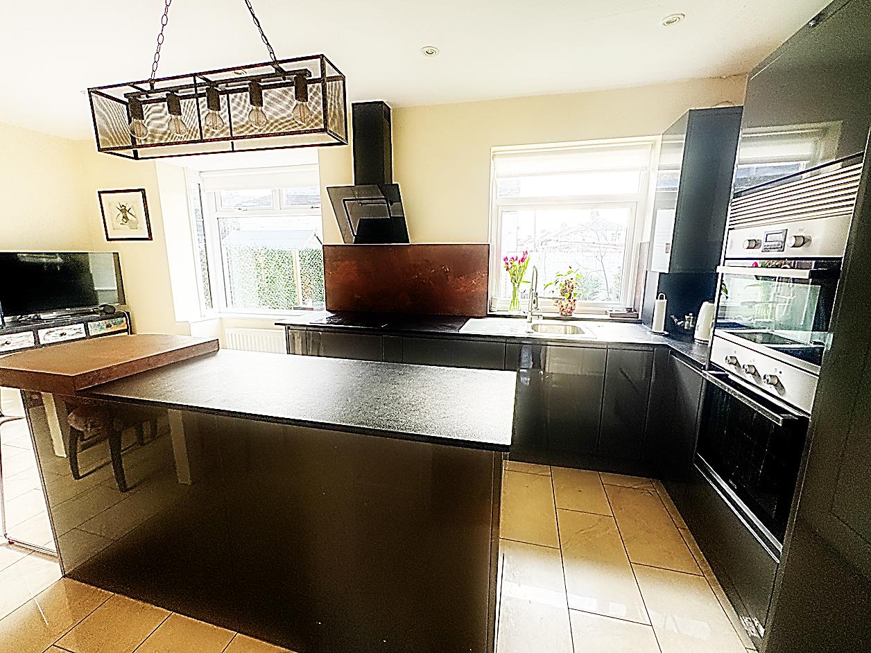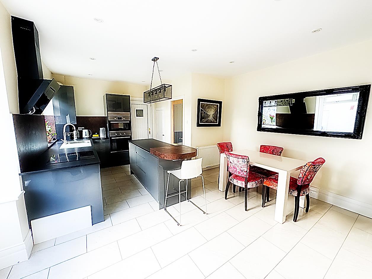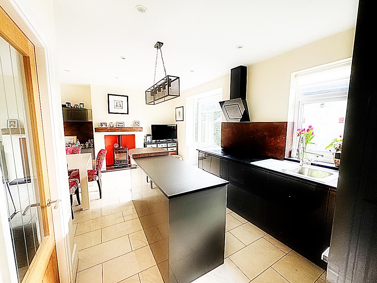 Kitchen/Diner - 5.73 max x 4.40 into bay x 2.85 (kitchen width) - Two Double glazed window, one being a bay window, wall and floor units, island with integrated fridge and freezer, built in double oven, electric hob with overhead extractor hood, integrated fridge, plumbed for washing machine