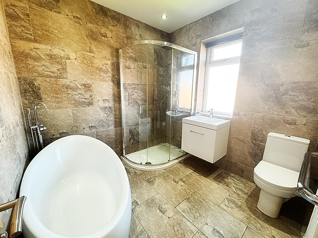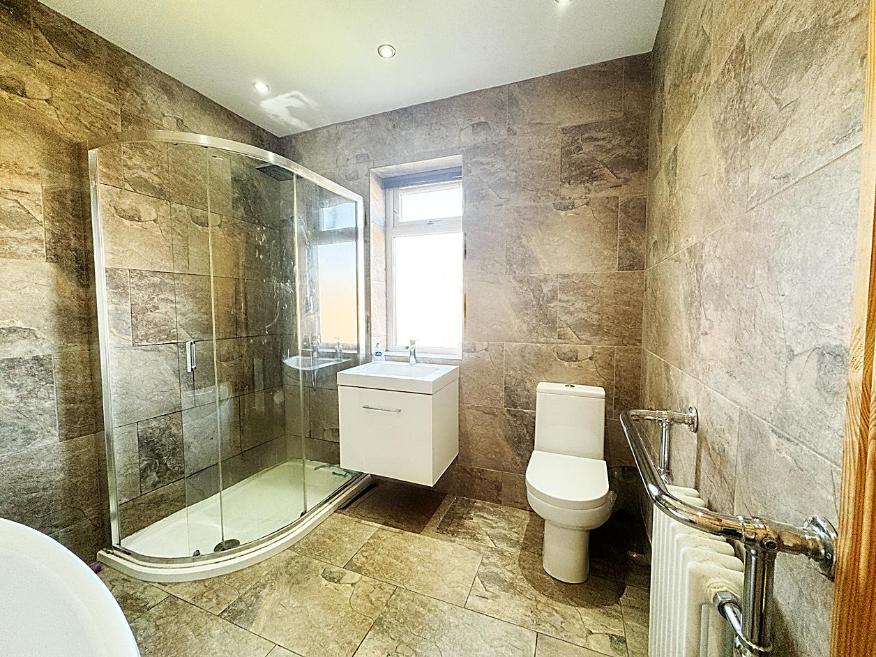 Bathroom - 2.47 x 2.42 (8'1" x 7'11" ) - Fully tiled walls and floor, shower cubicle, wall mounted wash hand basin, freestanding bath, WC, double glazed window and radiator.