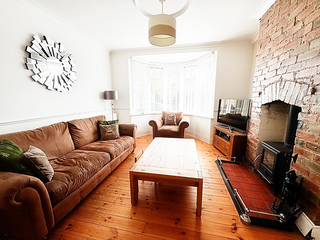 Lounge - 3.55m x 3.72m - Double glazed bay window, feature fireplace with living flame effect stove fire, wood flooring, radiator, double doors opening to the dining room.