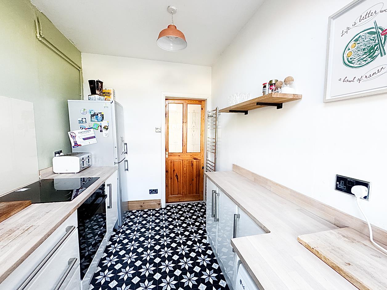 Kitchen - 3.54m x 2.10m - Fitted with a range of floor units with work surfaces over, sink, built in oven and hob, ladder style radiator, double glazed window.