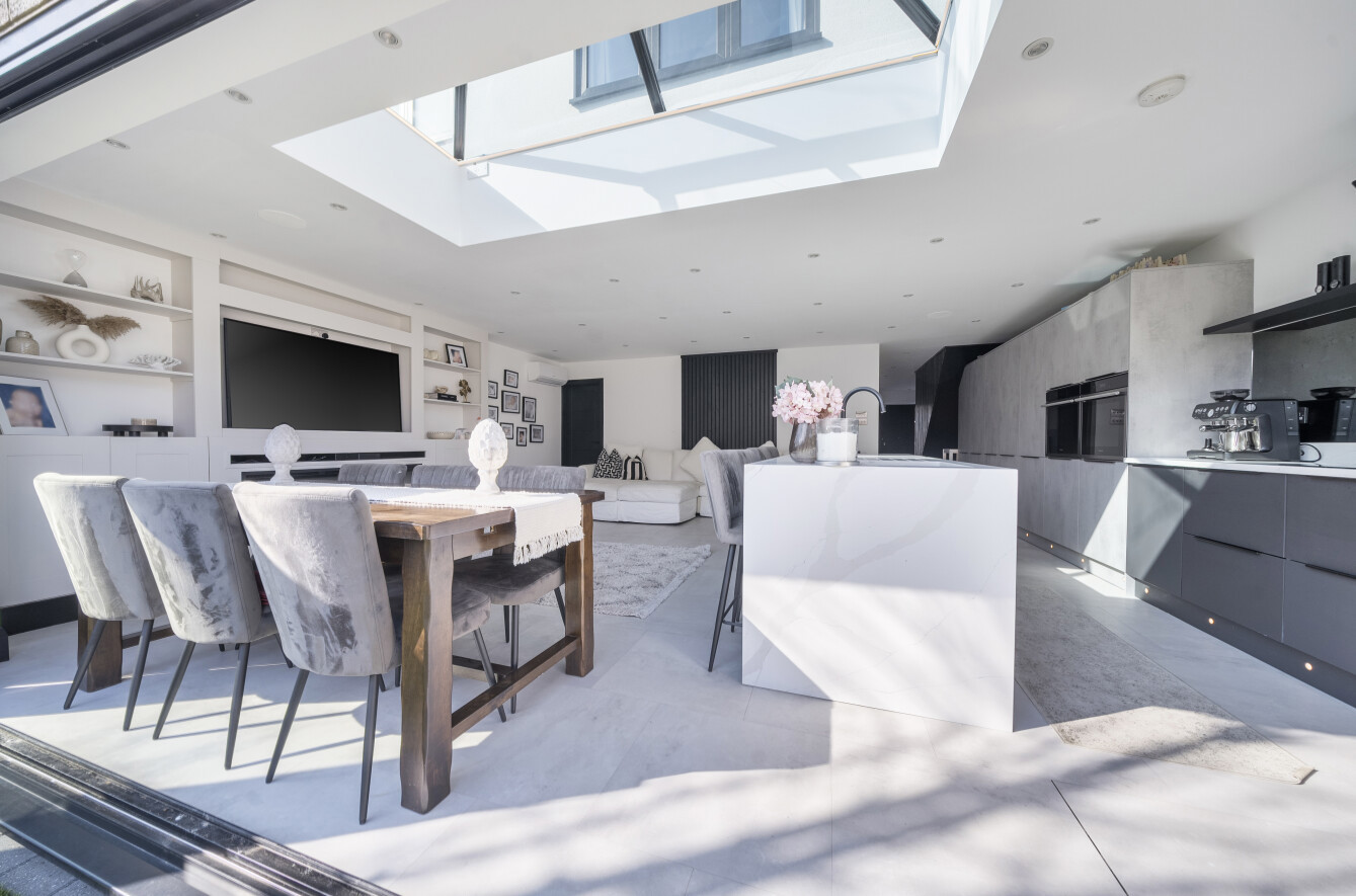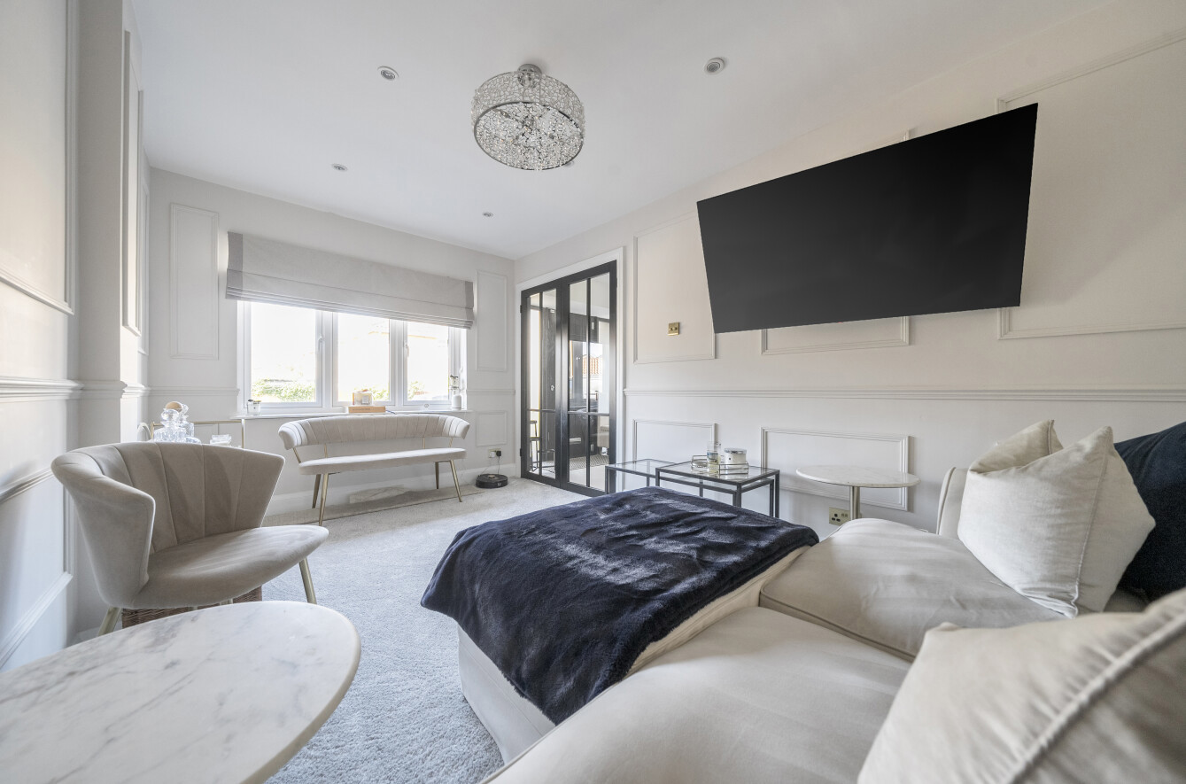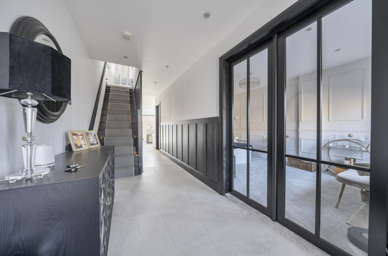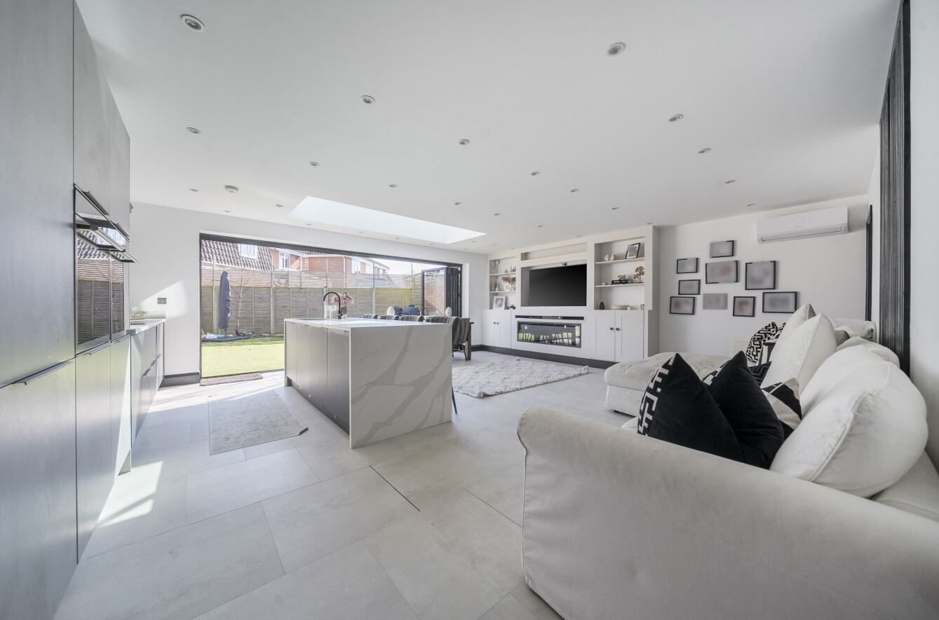 The property offers well thought out accommodation. The front door opens into a stylish entrance hall with feature glazed doors leading into a separate reception room which would make either an ideal grown ups living room or a family room/playroom. Forming the heart of this family home is a stunning openplan kitchen/living/dining room with bi-fold doors opening out to the rear garden and a roof lantern flooding the space with natural light. Set out in three distinct areas, the kitchen comprises a comprehensive range of sleek wall and base units with a large central island, Quartz worktops and space for appliances. The vendors have created a media wall with custom built storage and display shelving. There is also a separate utility room and a two piece downstairs cloakroom.