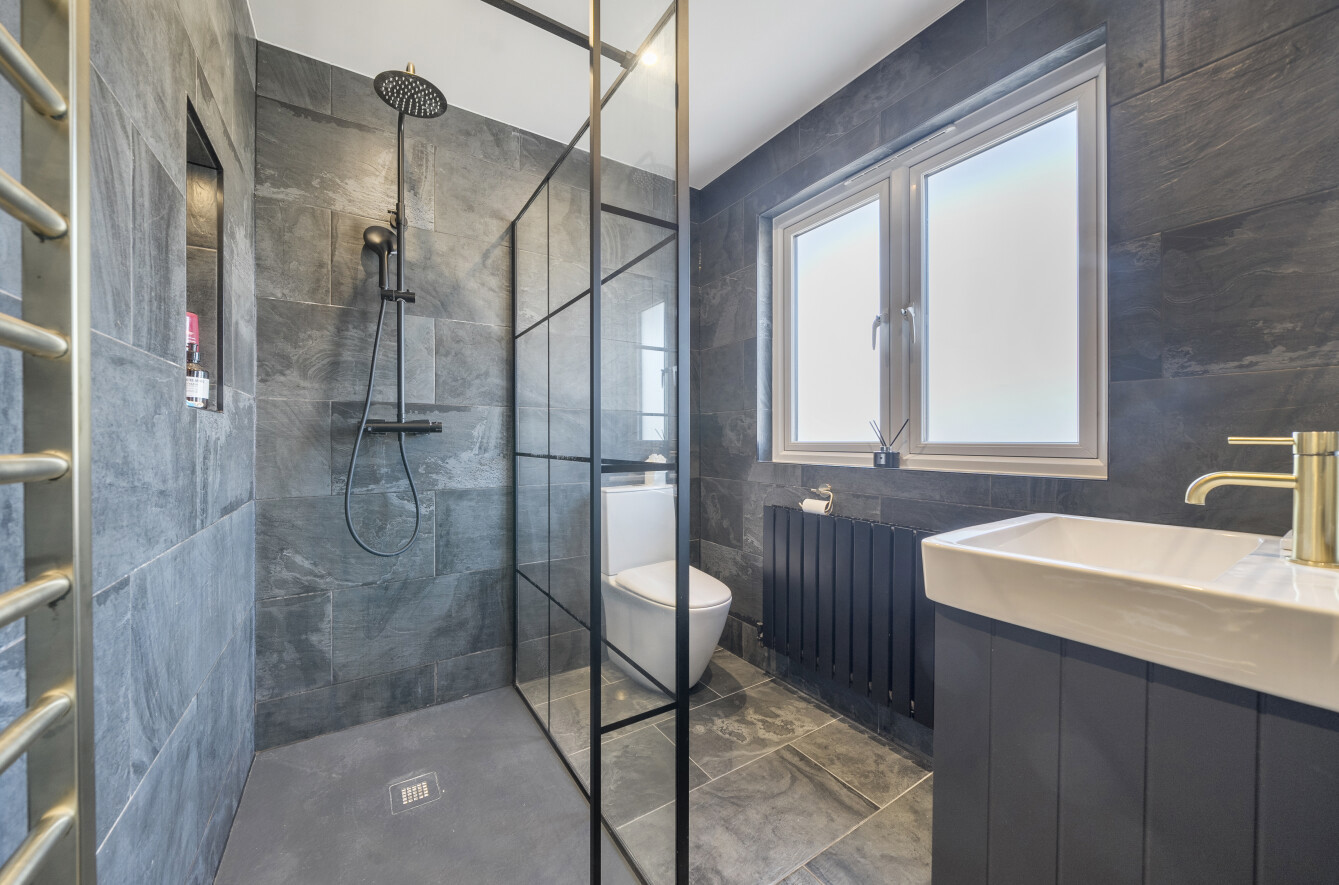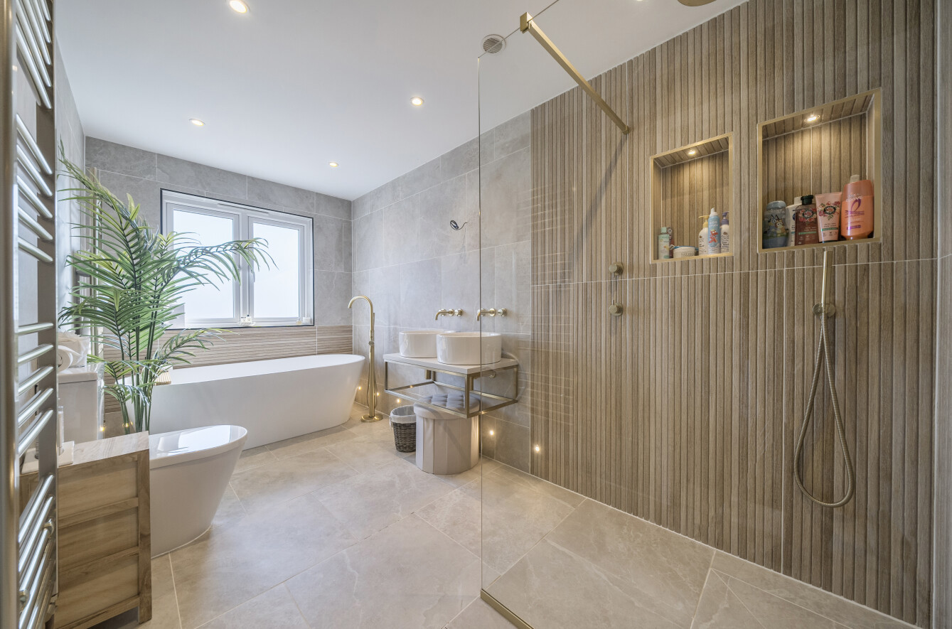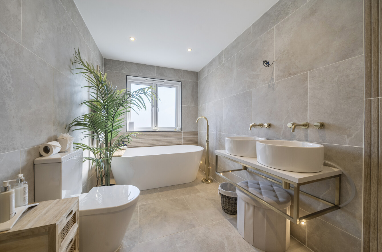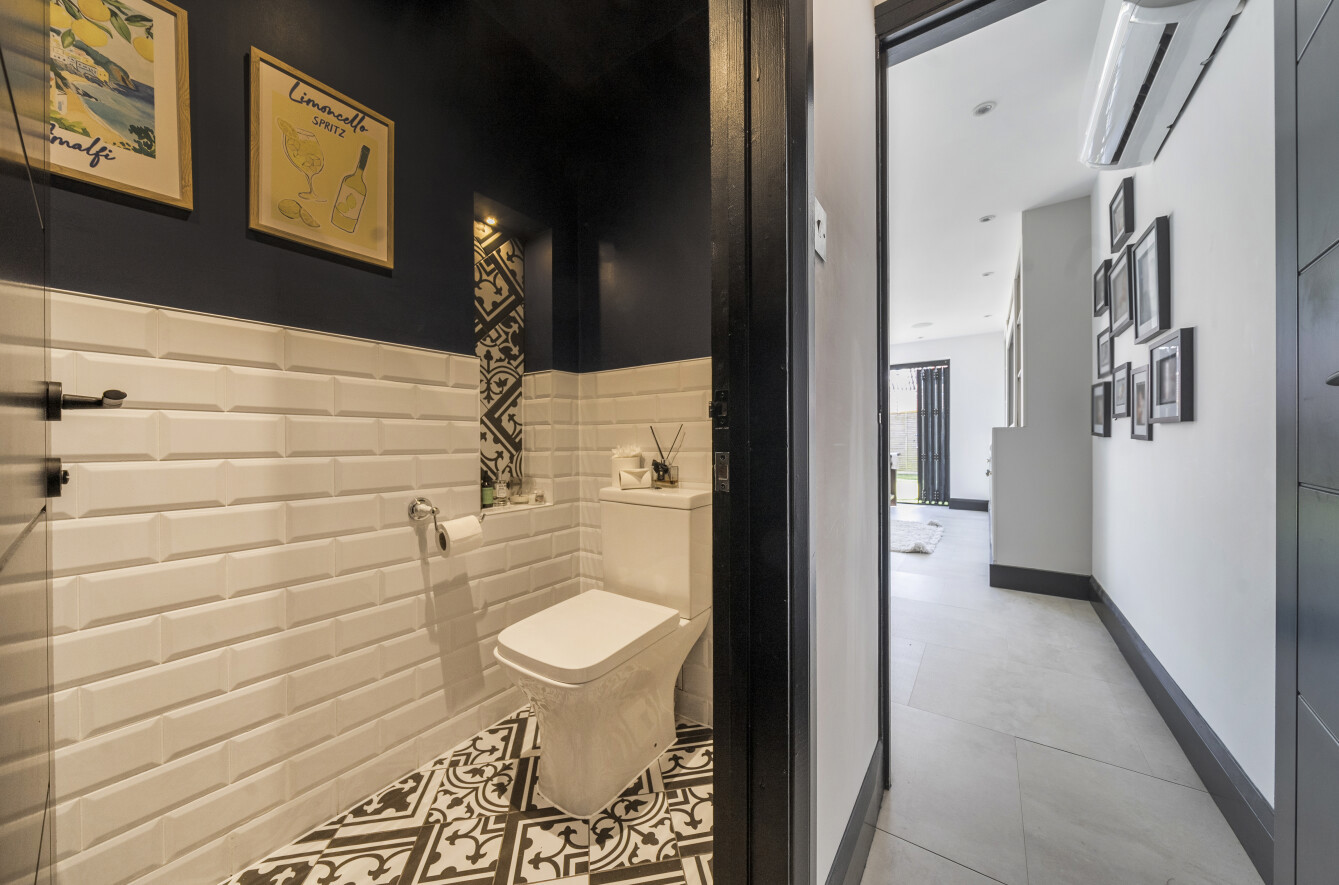 The property offers well thought out accommodation. The front door opens into a stylish entrance hall with feature glazed doors leading into a separate reception room which would make either an ideal grown ups living room or a family room/playroom. Forming the heart of this family home is a stunning openplan kitchen/living/dining room with bi-fold doors opening out to the rear garden and a roof lantern flooding the space with natural light. Set out in three distinct areas, the kitchen comprises a comprehensive range of sleek wall and base units with a large central island, Quartz worktops and space for appliances. The vendors have created a media wall with custom built storage and display shelving. There is also a separate utility room and a two piece downstairs cloakroom.