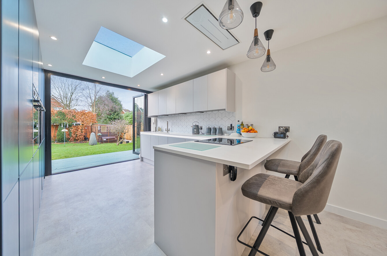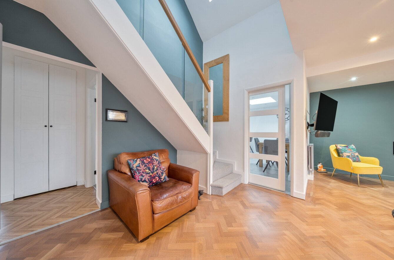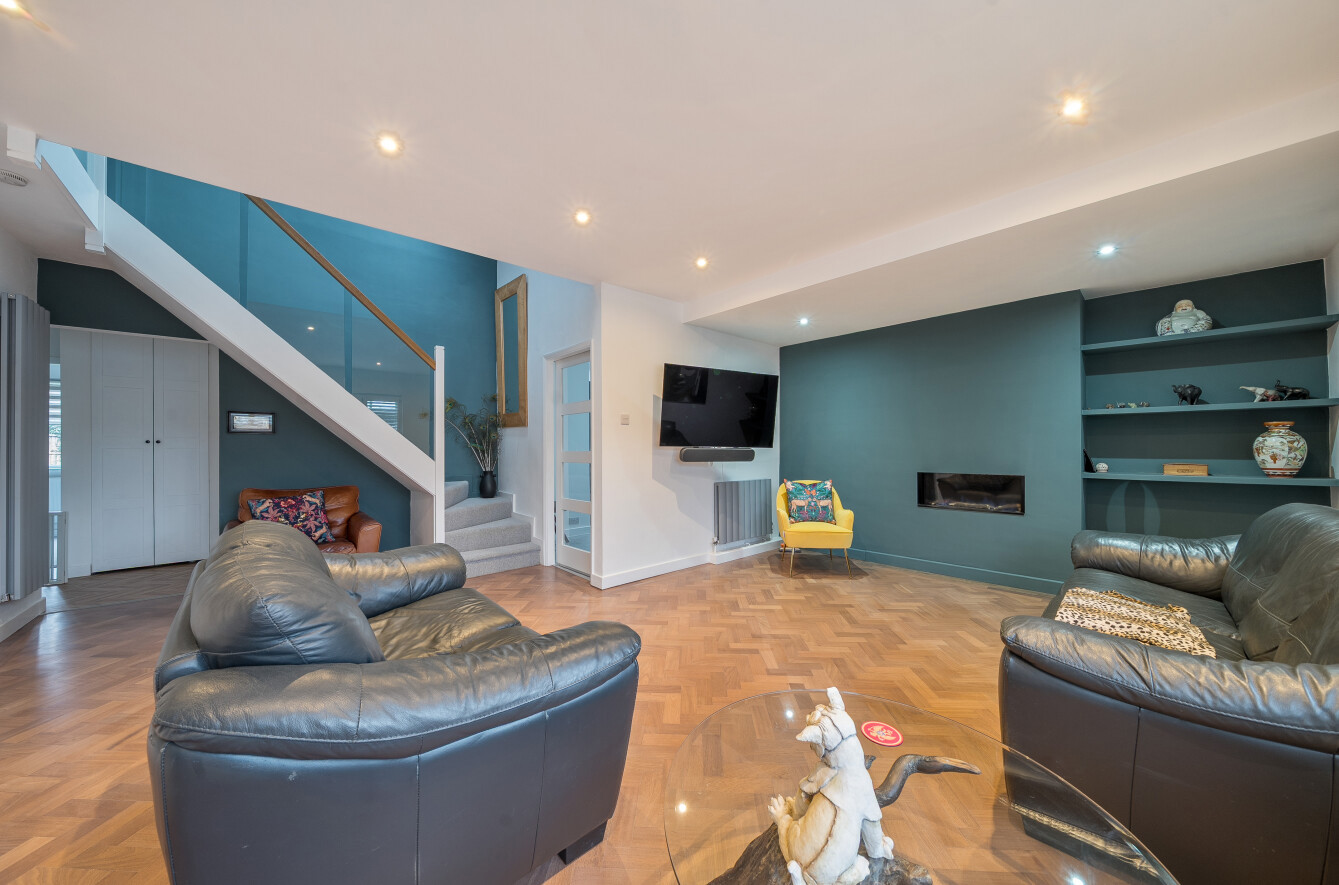 The ground floor accommodation is particularly flexible and well suited to modern family life. The impressive kitchen/diner forms the heart of the home, enhanced by two skylights that flood the space with natural light, bi-fold doors opening onto a decking area, and views over the mature rear garden. A separate lounge/diner offers a more formal yet welcoming setting, featuring aluminium radiators, a gas fire, original parquet herringbone flooring, plantation shutters to the front window, downlights and a stylish feature wall.