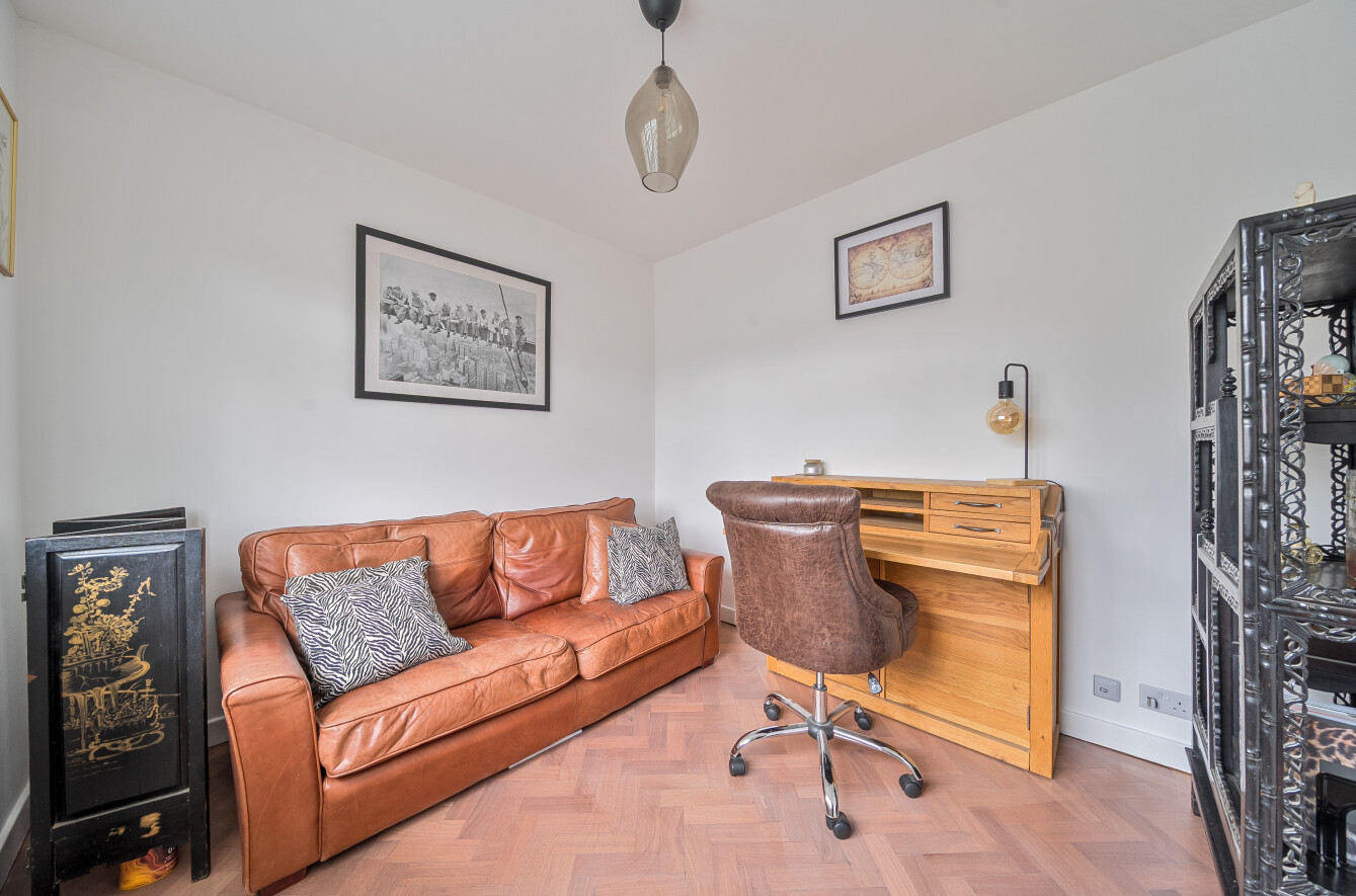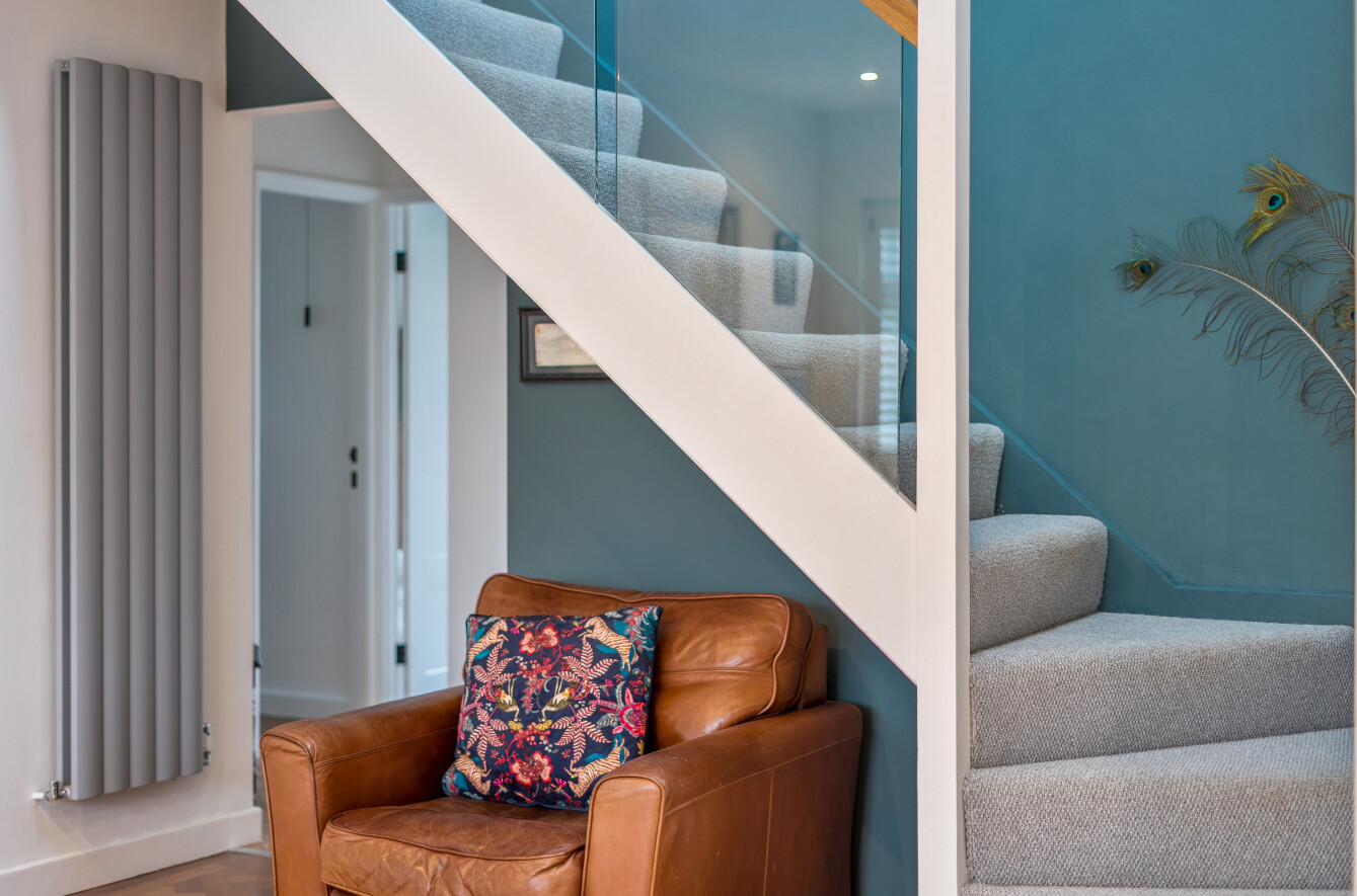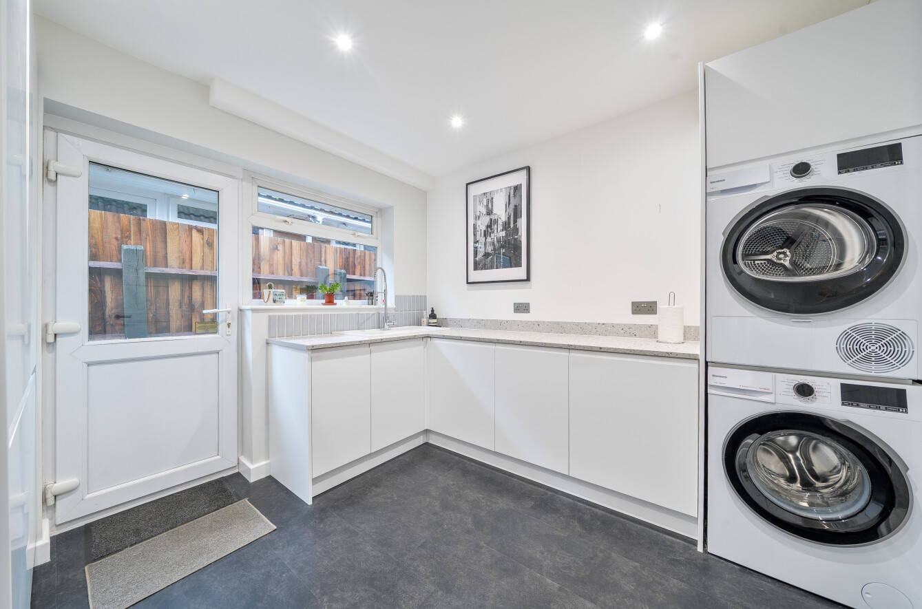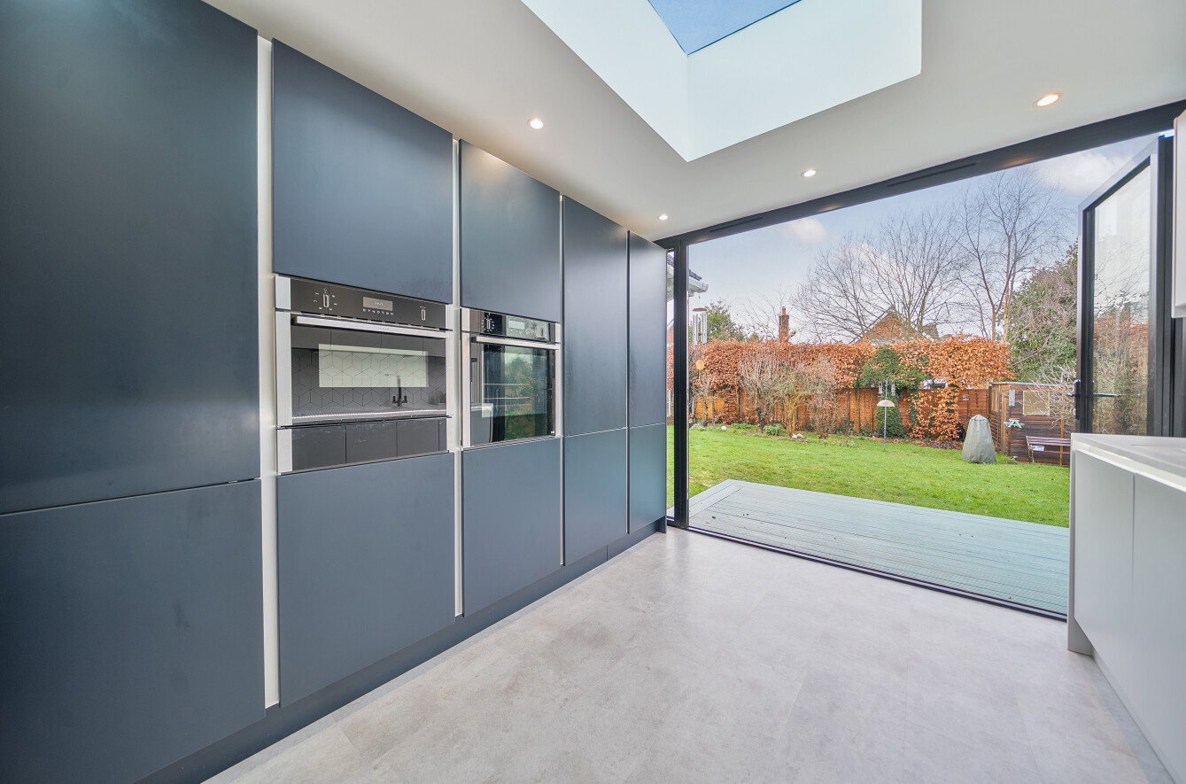 The ground floor accommodation is particularly flexible and well suited to modern family life. The impressive kitchen/diner forms the heart of the home, enhanced by two skylights that flood the space with natural light, bi-fold doors opening onto a decking area, and views over the mature rear garden. A separate lounge/diner offers a more formal yet welcoming setting, featuring aluminium radiators, a gas fire, original parquet herringbone flooring, plantation shutters to the front window, downlights and a stylish feature wall.