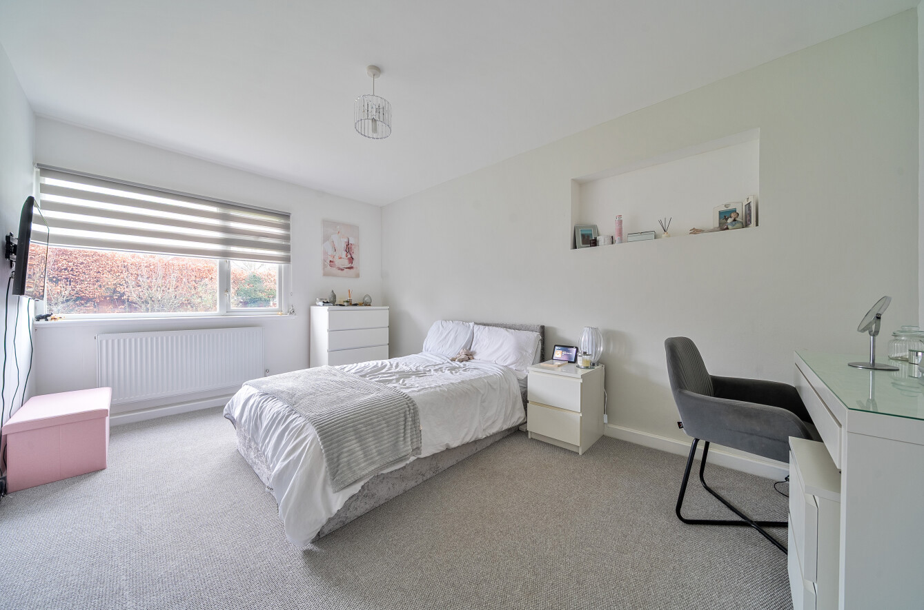 To the first floor, a staircase with glass balustrade and oak handrail leads to two generous double bedrooms. Bedroom two includes plantation shutters, extensive built-in wardrobes, an airing cupboard and additional eaves and loft storage. The principal bedroom enjoys a rear aspect, plantation shutters, substantial built-in wardrobes and further eaves storage. A contemporary bathroom completes the accommodation with a walk-in shower.