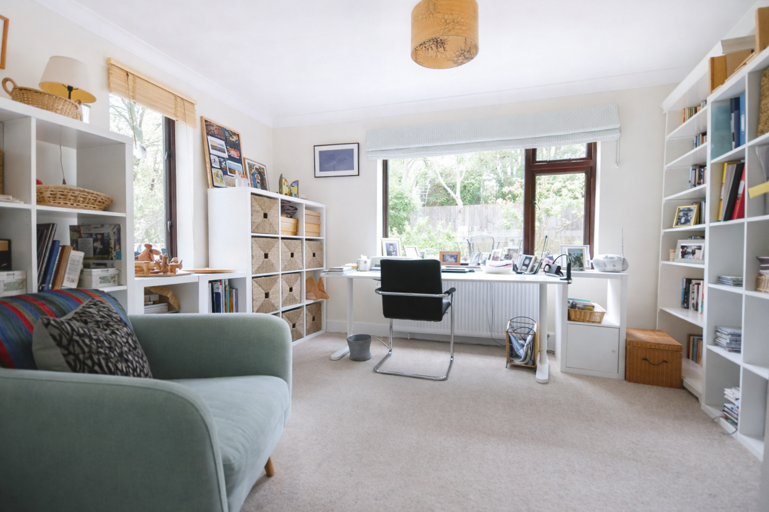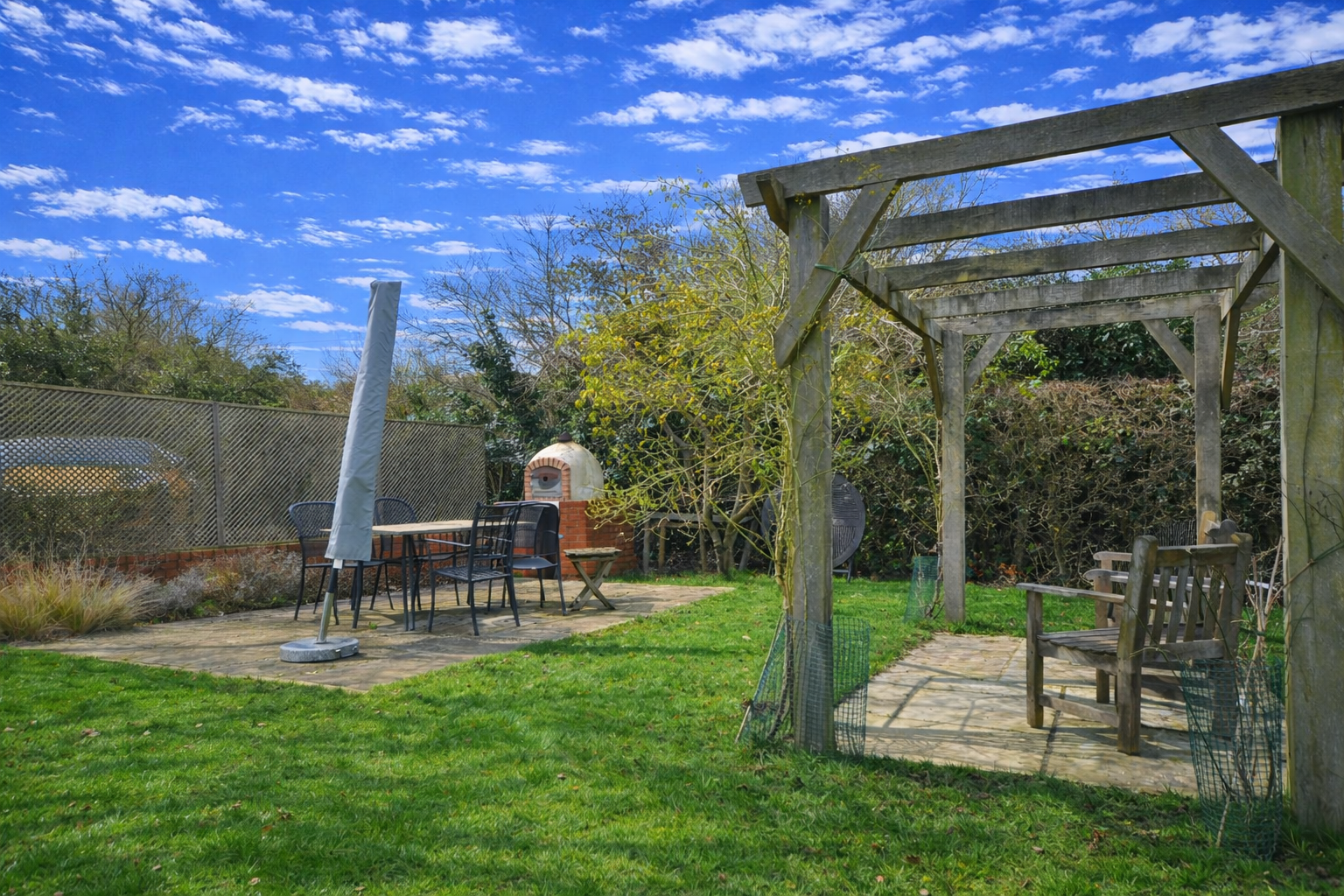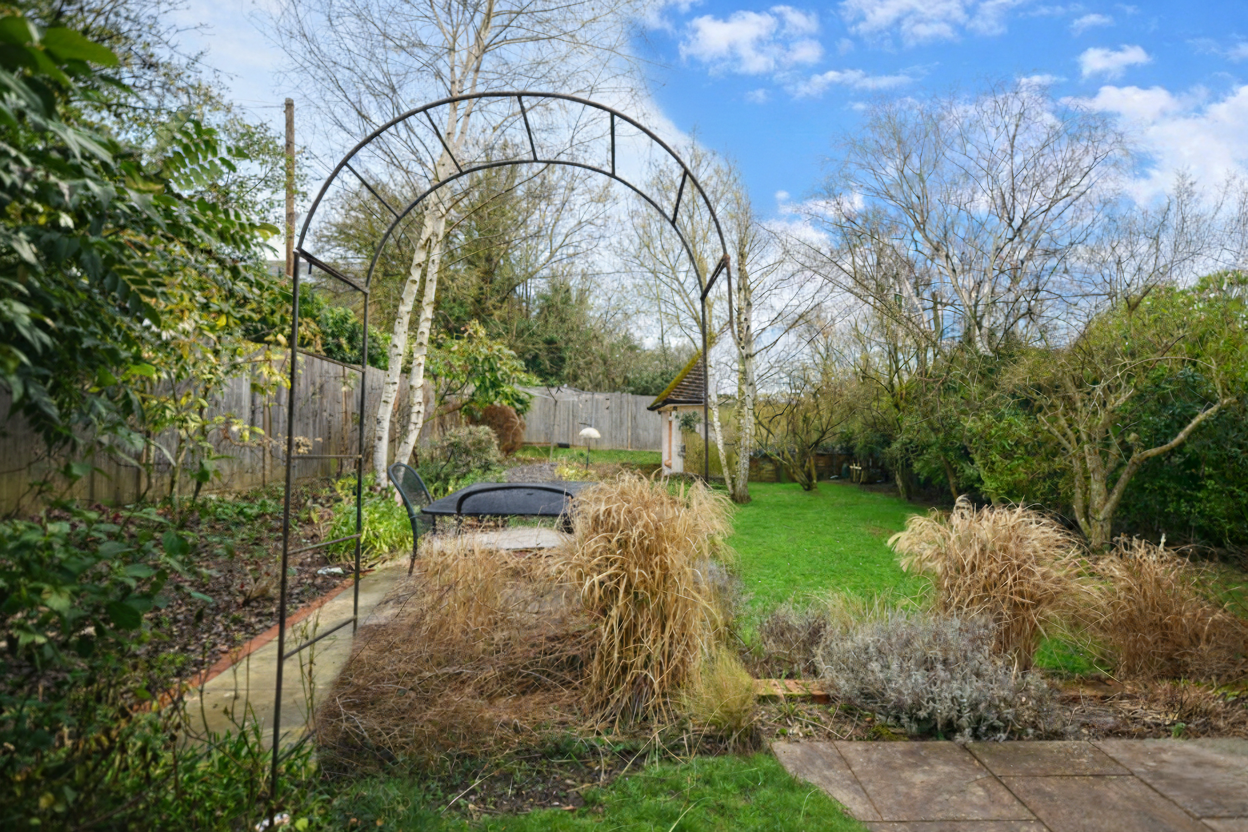 The gardens have been carefully cultivated and now provide a mature and private setting. Apple, plum, cherry, and birch trees offer seasonal blossom and autumn colour, while wide stretches of lawn create space for play and relaxation. A pergola-covered seating area and pizza oven provide an idyllic spot for summer entertaining. Enhancing the practicality of the outdoor space, the property features a dedicated external bike shed alongside a substantial main garden shed, providing excellent storage space.