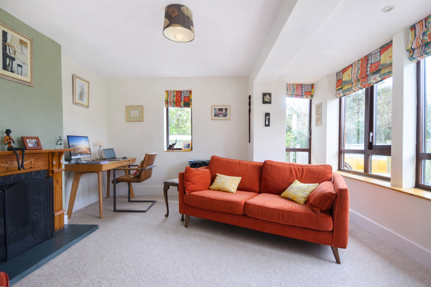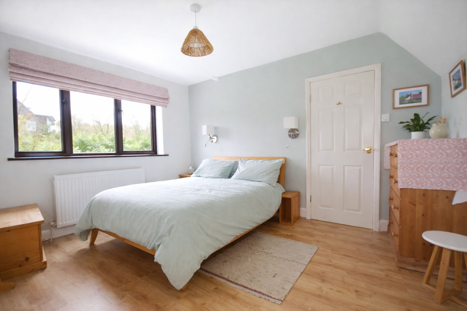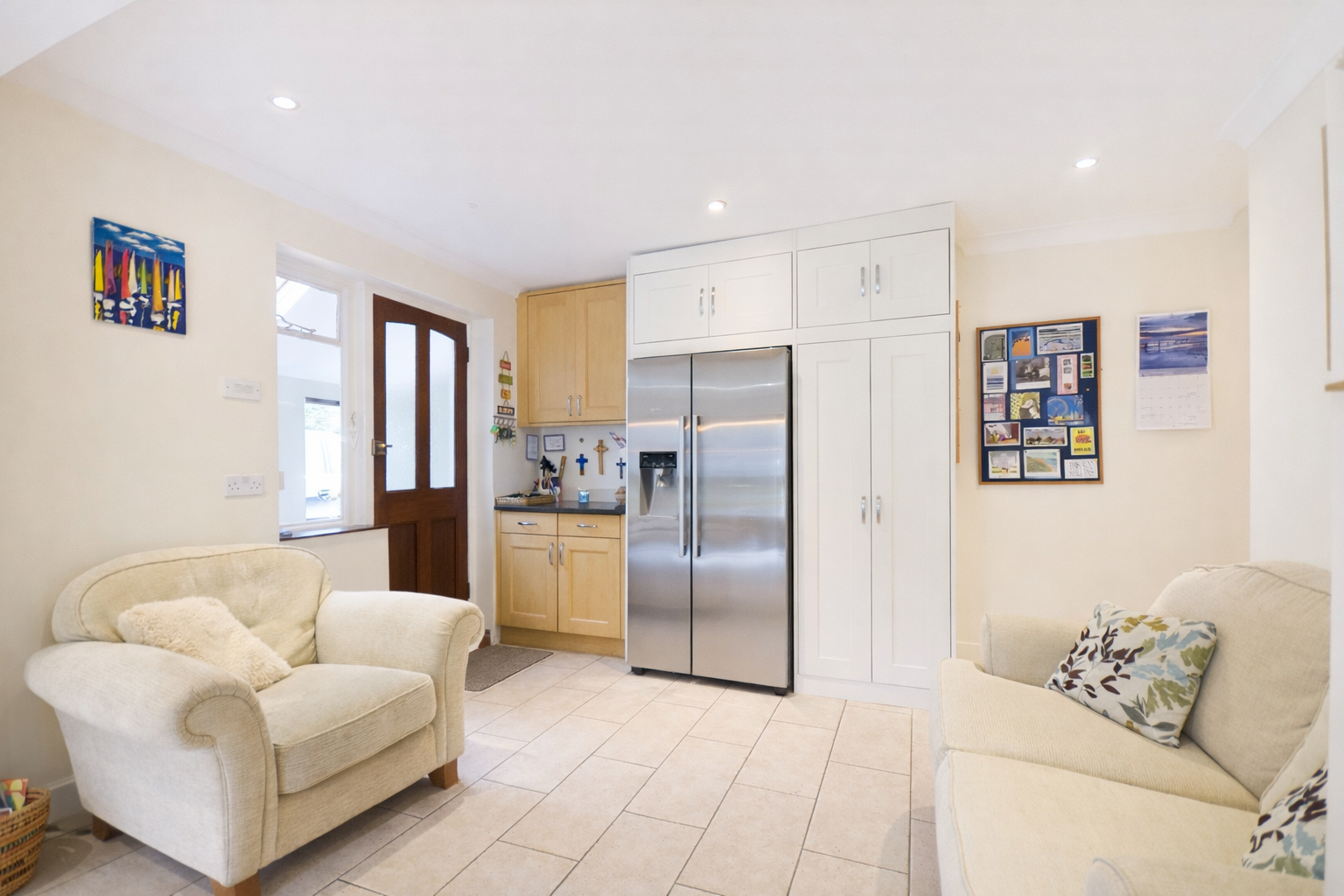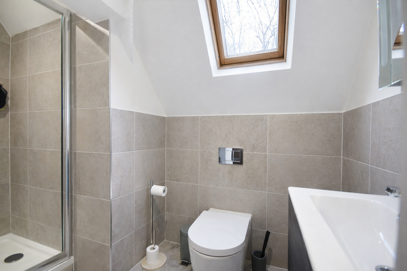 Upstairs, a bright landing illuminated by a skylight leads to four well-proportioned bedrooms and a family bathroom. The principal bedroom enjoys a contemporary en suite shower room and a calm, neutral decorative scheme. The remaining bedrooms are all doubles, thoughtfully presented, while the family bathroom offers a four-piece suite finished in classic white with subtle detailing.