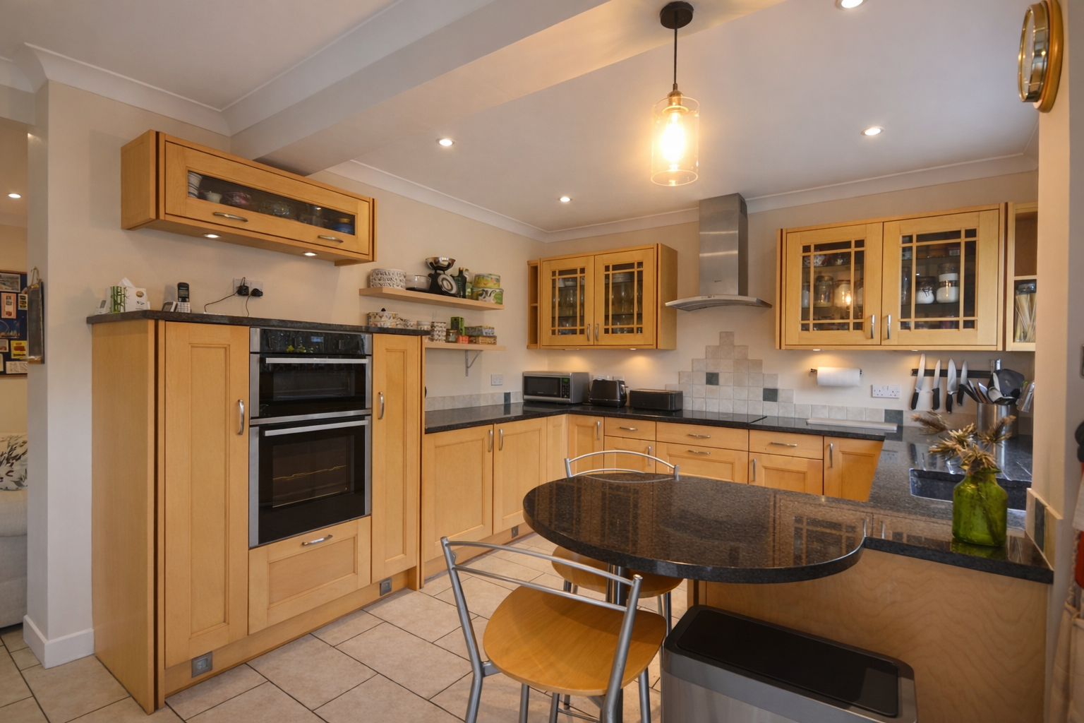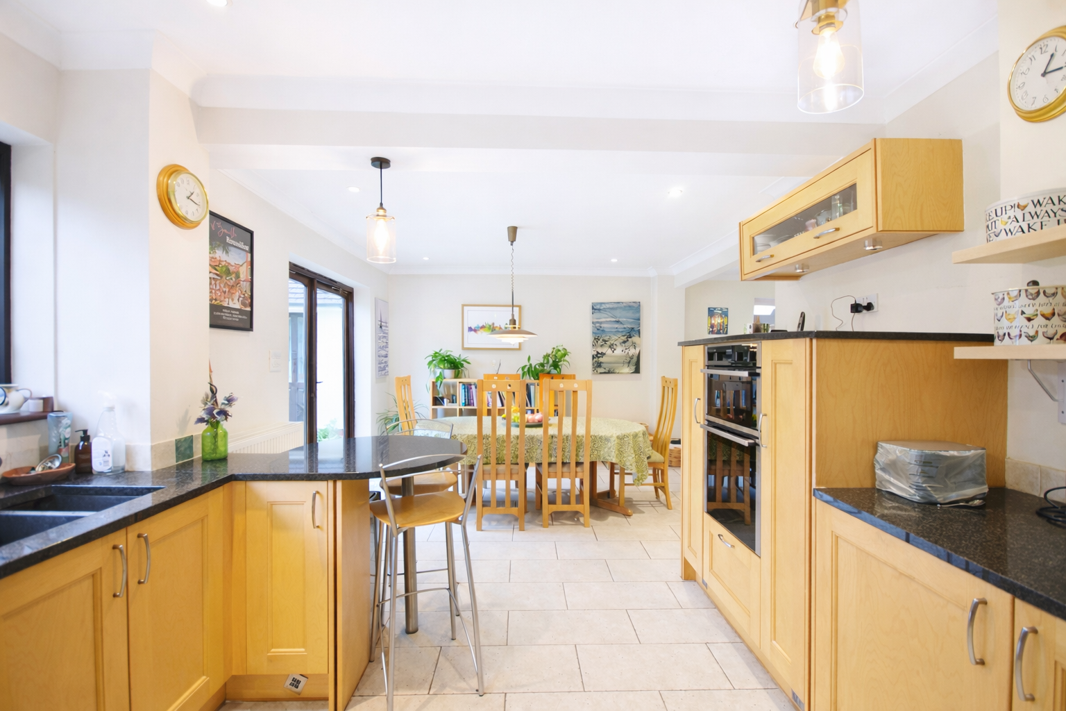 Double doors open into an entrance porch and onward into a gracious reception hall laid with parquet flooring, where natural light filters in softly. The principal sitting room is a delightful and generously proportioned space, centred around a handsome stone fireplace housing the wood burner — an inviting focal point for winter evenings and relaxed family gatherings. Large windows frame views of the surrounding greenery, while double doors lead through to a dual-aspect study overlooking the garden, offering a peaceful retreat for work or quiet reflection. On the opposite side of the hall lies a more intimate drawing room with an open fireplace and outlook to the front — a wonderfully cosy setting. At the heart of the house is the impressive L-shaped kitchen and breakfast room, designed with family life in mind. Fitted with maple cabinetry and polished black granite worktops, it incorporates a breakfast bar, integrated double oven, induction hob and double fridge. Beyond the kitchen area, a generous dining and sitting space allows for both everyday living and larger gatherings, with French doors opening onto the terrace and gardens beyond — a seamless connection between house and landscape.