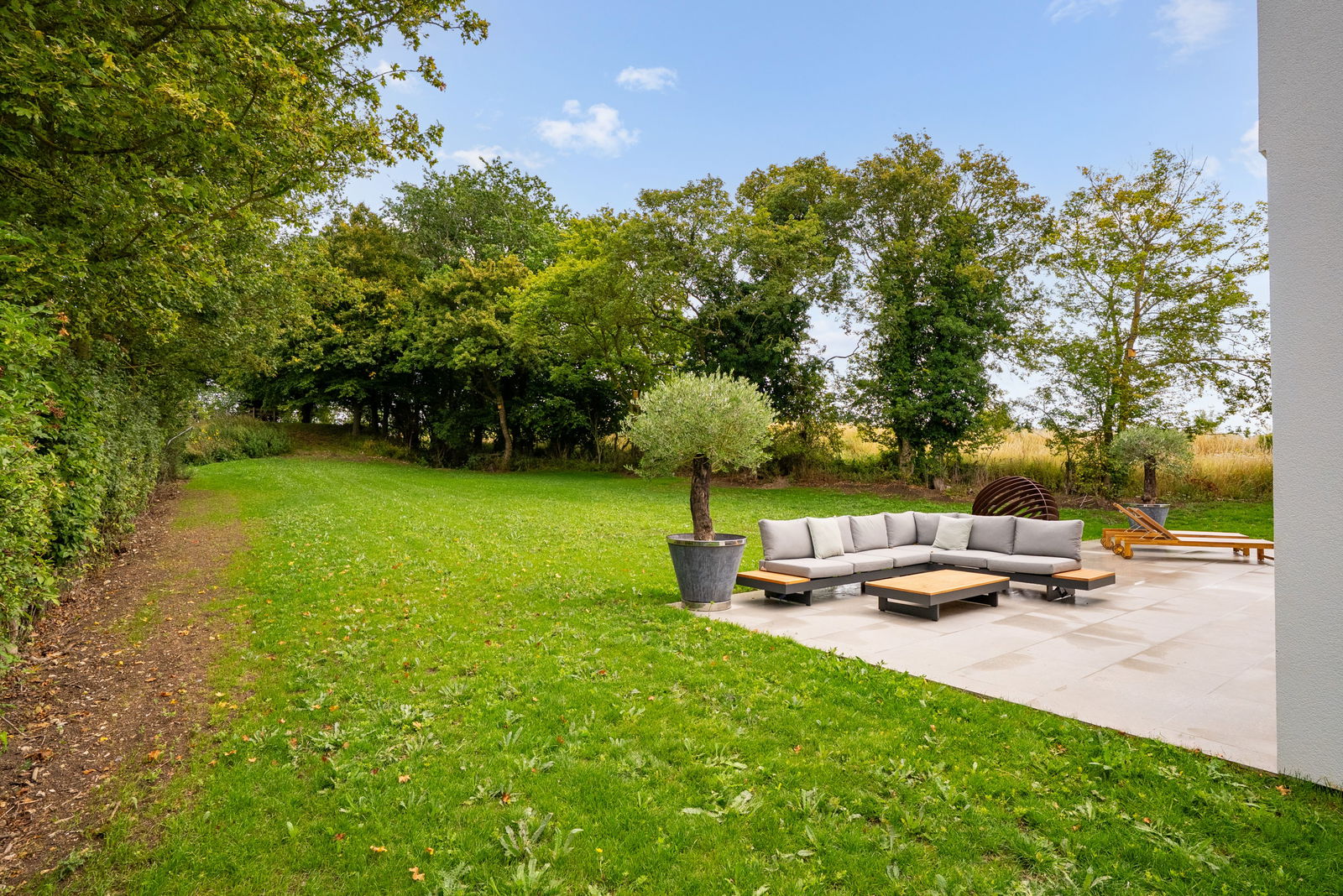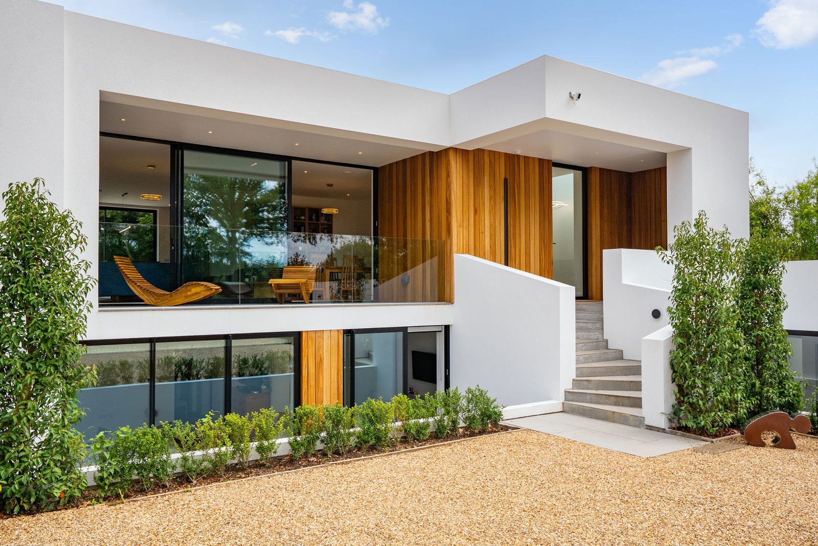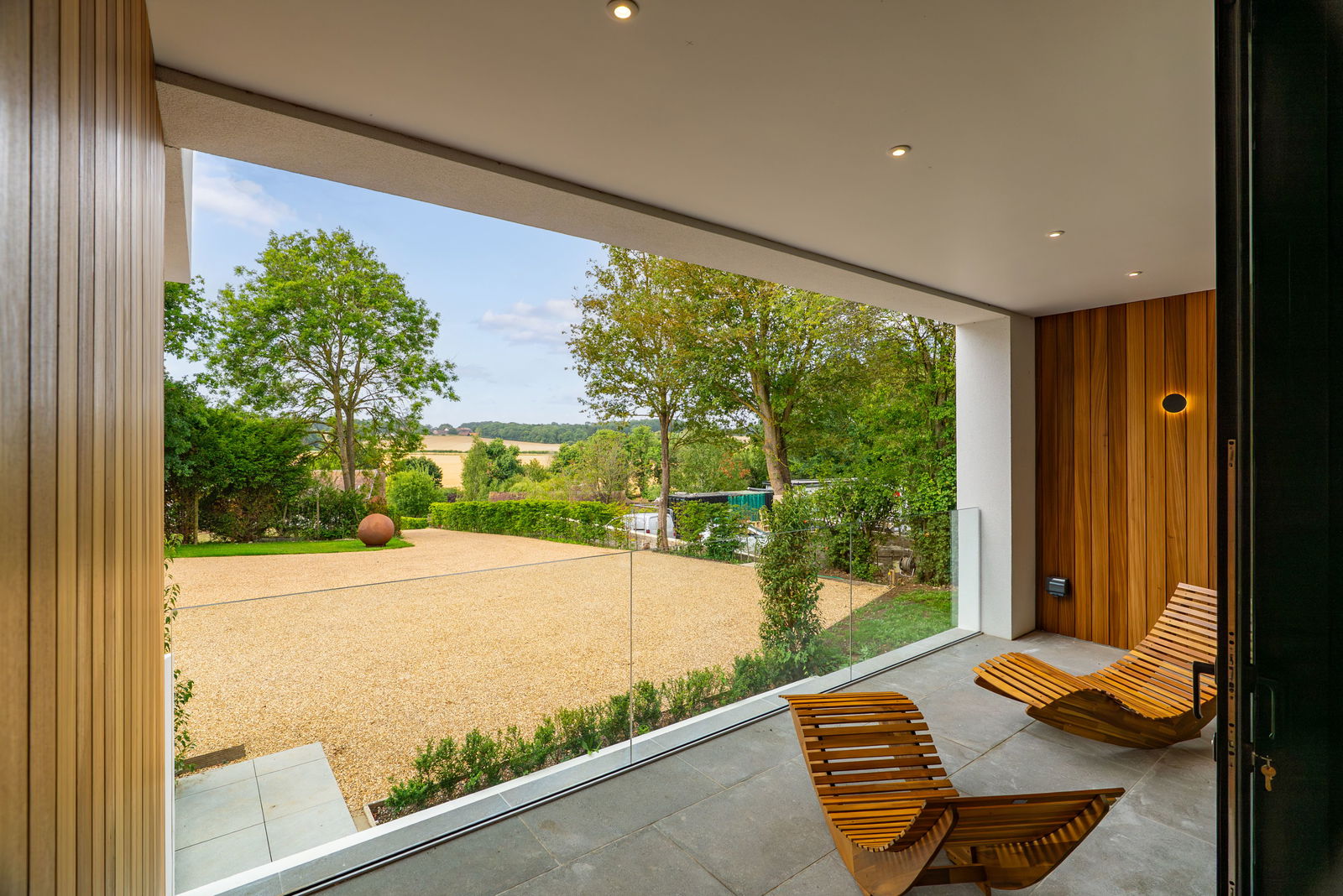 The property is approached by a sweeping gravel driveway, offering ample parking space for multiple vehicles. As you enter, the carefully landscaped grounds guide you towards the front of the house, enhancing the sense of privacy and peace. The grounds are meticulously designed, offering lush greenery, natural beauty, and an overall sense of tranquility.