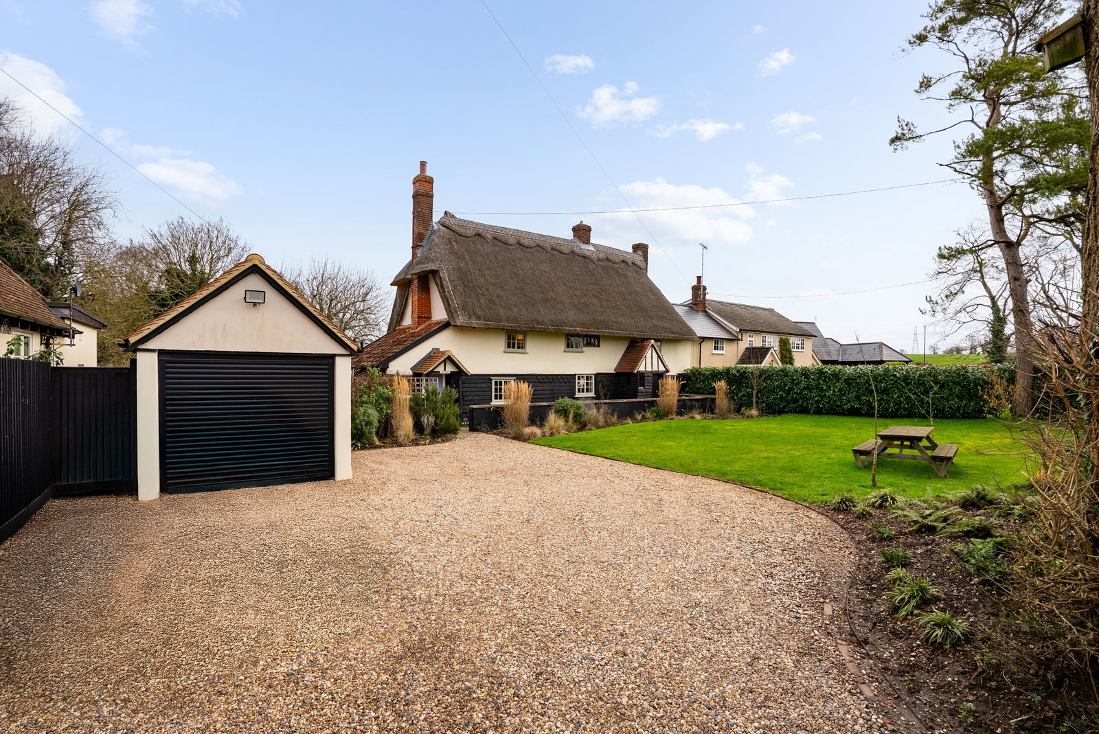 The orientation ensures sunlight moves beautifully across the garden throughout the day, illuminating the thatched roof and historic elevations in a way that feels quintessentially English. From almost every angle, the house and garden complement one another — a setting that enhances the cottage’s architectural charm rather than competing with it.