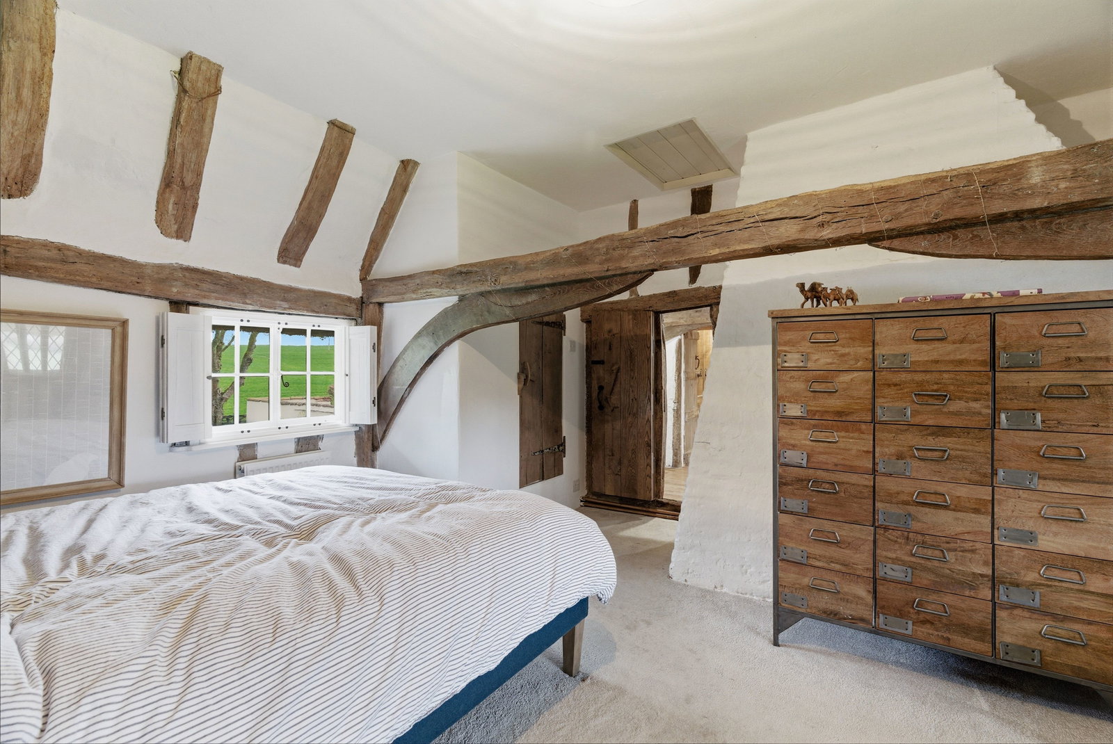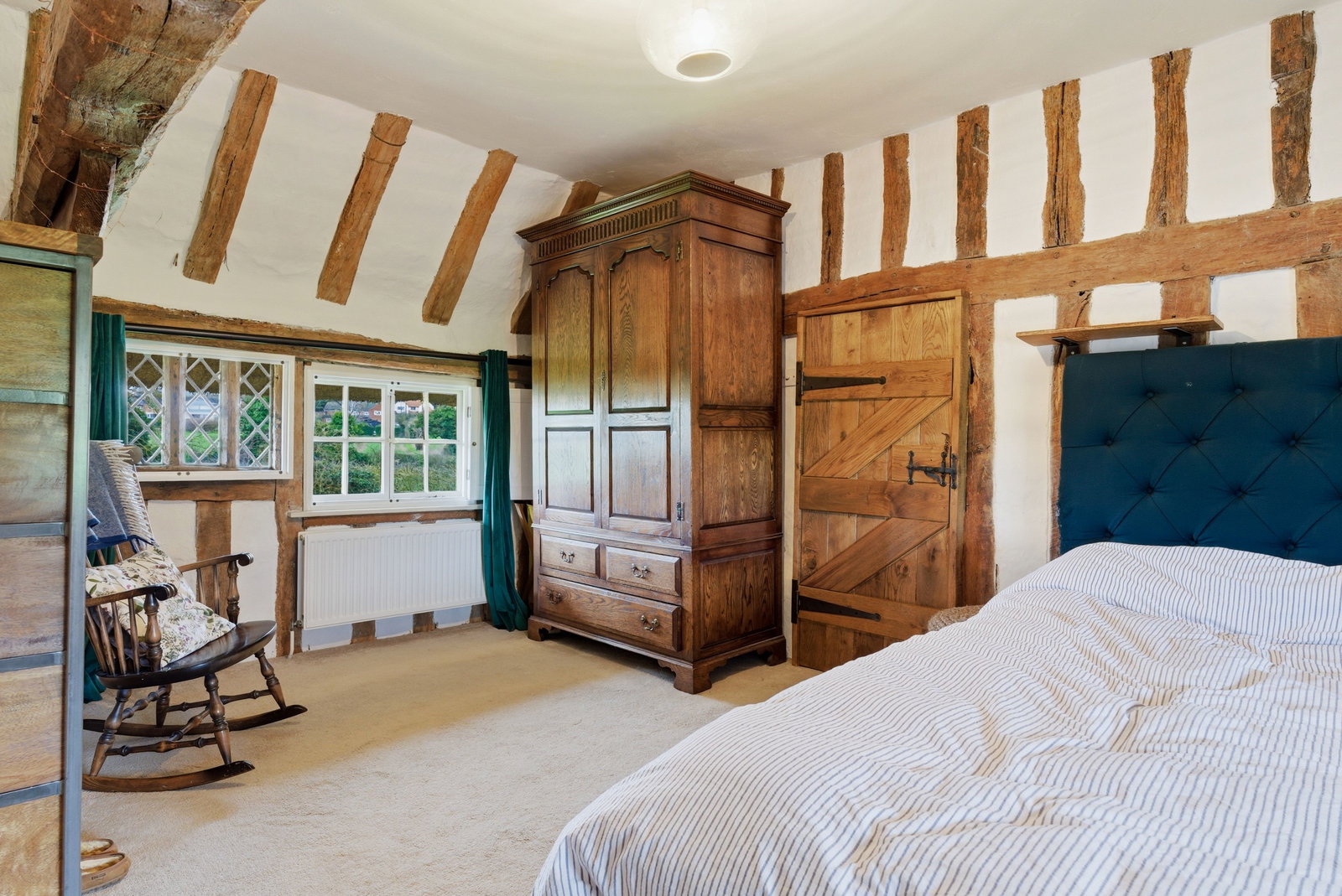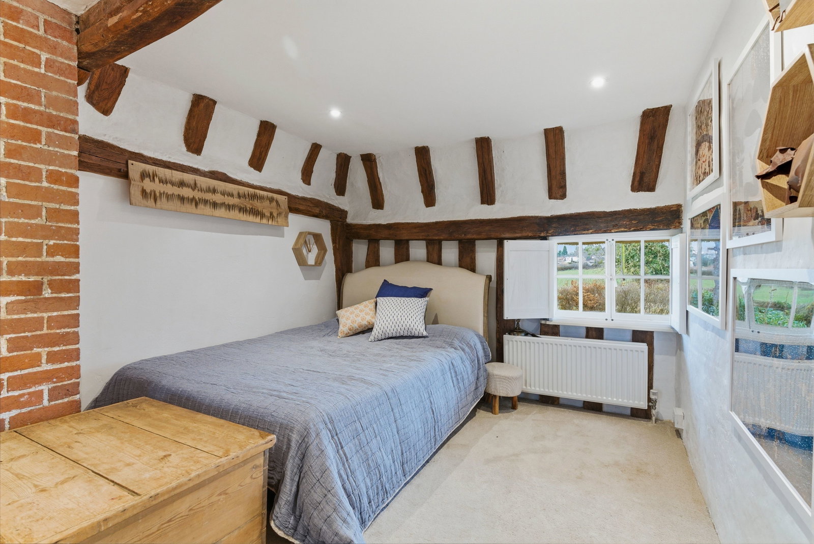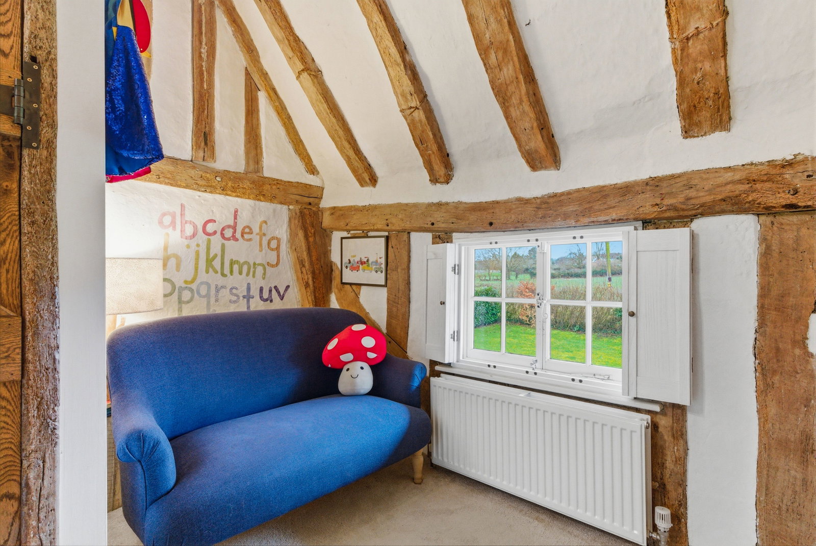 Upstairs, the bedrooms continue the story of the house. Well-proportioned and filled with character, they enjoy attractive aspects over the surrounding gardens and village rooftops. The principal bedroom offers an especially charming retreat, with exposed timbers and a peaceful outlook. The remaining bedrooms provide flexibility for family living, guests or home working, all served by well-appointed bath and shower facilities.