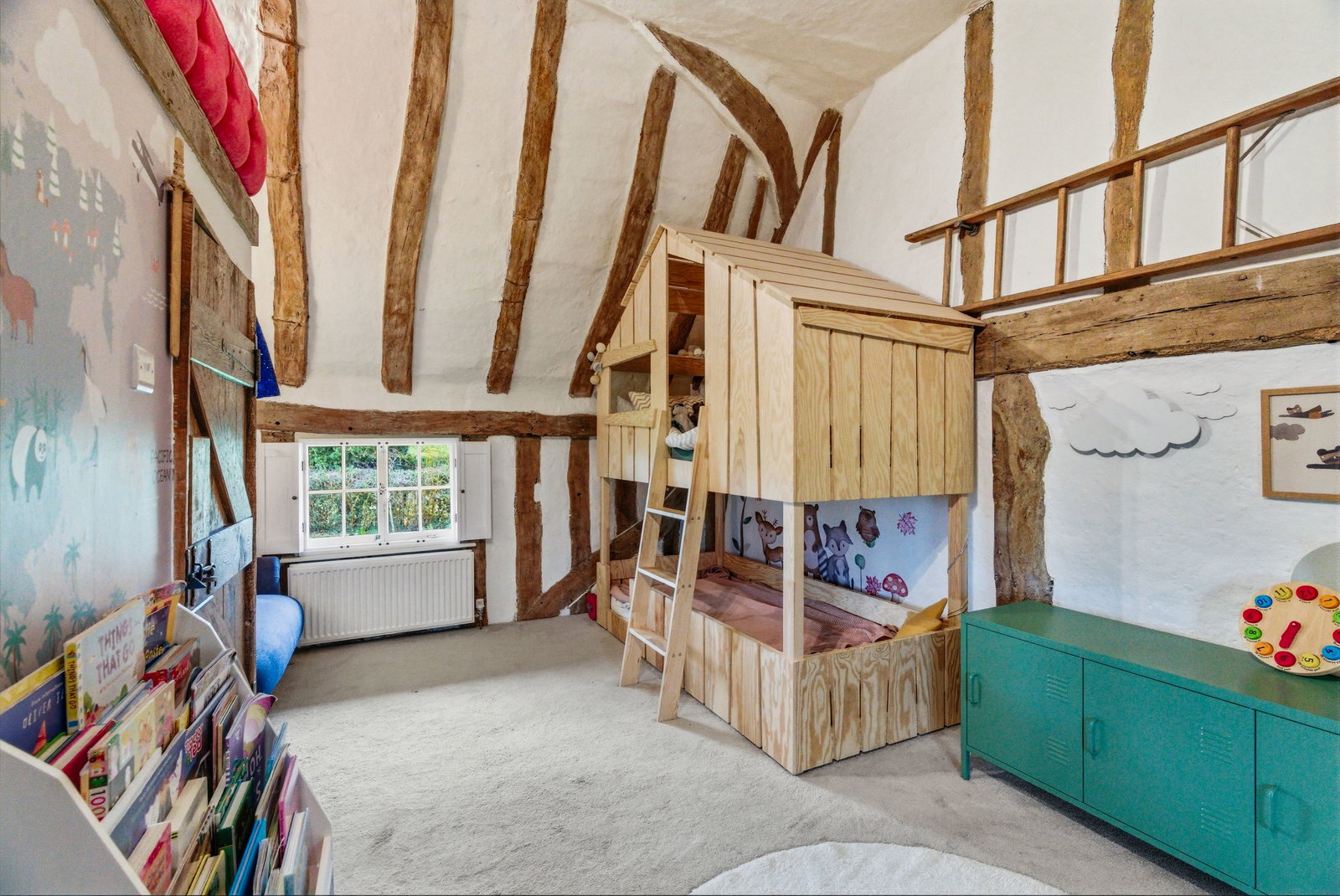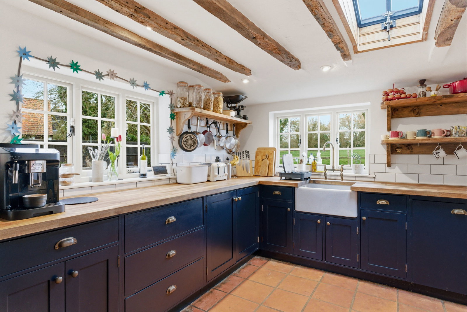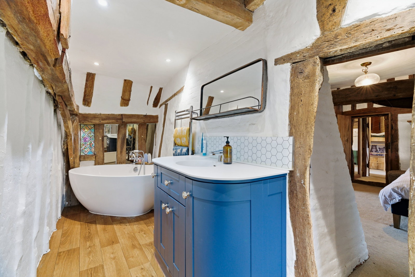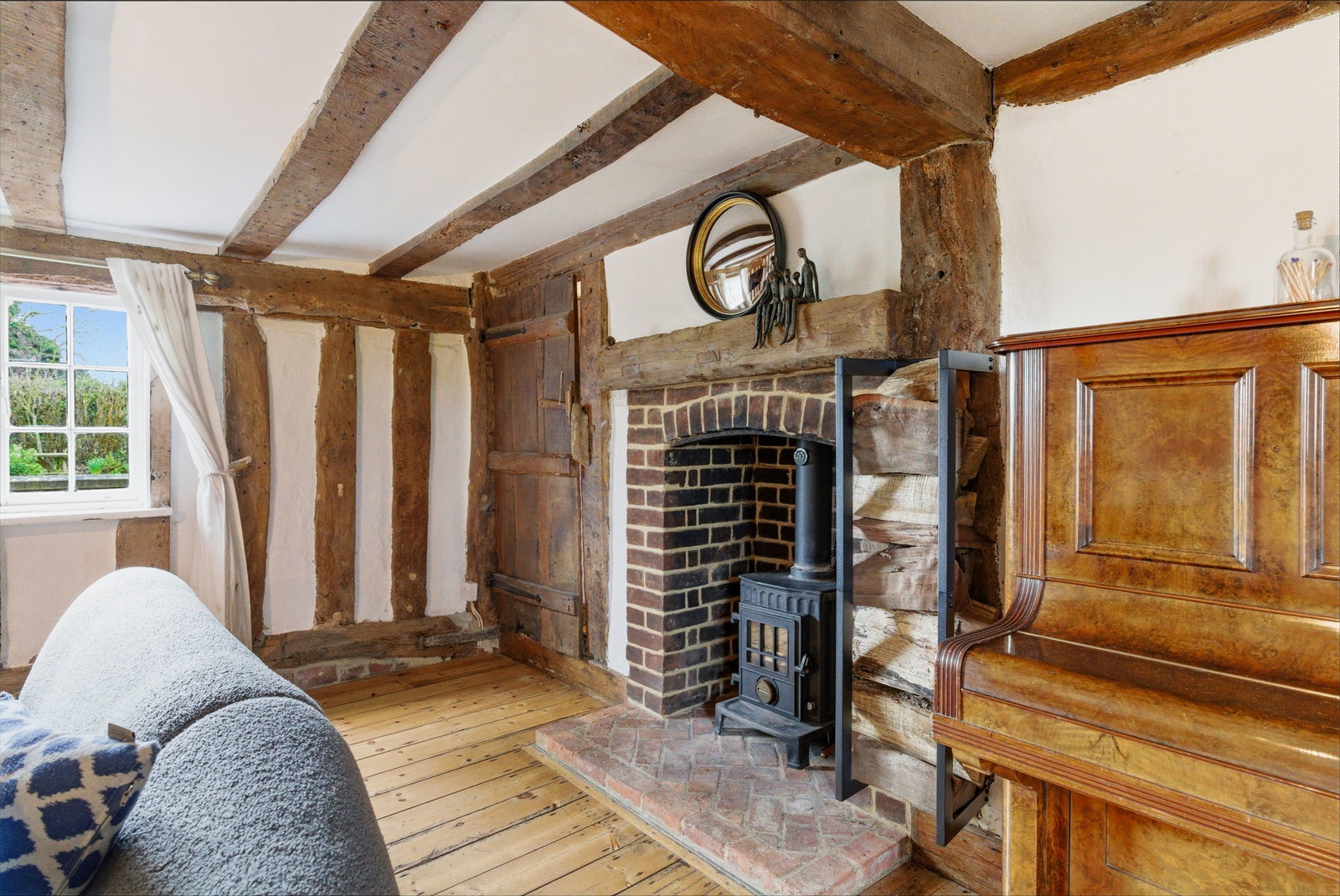 Upstairs, the bedrooms continue the story of the house. Well-proportioned and filled with character, they enjoy attractive aspects over the surrounding gardens and village rooftops. The principal bedroom offers an especially charming retreat, with exposed timbers and a peaceful outlook. The remaining bedrooms provide flexibility for family living, guests or home working, all served by well-appointed bath and shower facilities.