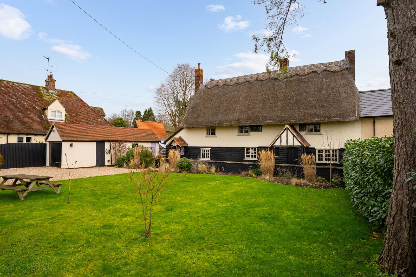 The gardens are predominantly laid to lawn, framed by mature hedging, shrubs and seasonal planting that provide colour and texture throughout the year. Carefully tended borders soften the elevations of the cottage, while specimen trees, including a beautiful old apple tree, create dappled shade during the warmer months and reinforce the sense of maturity and permanence.