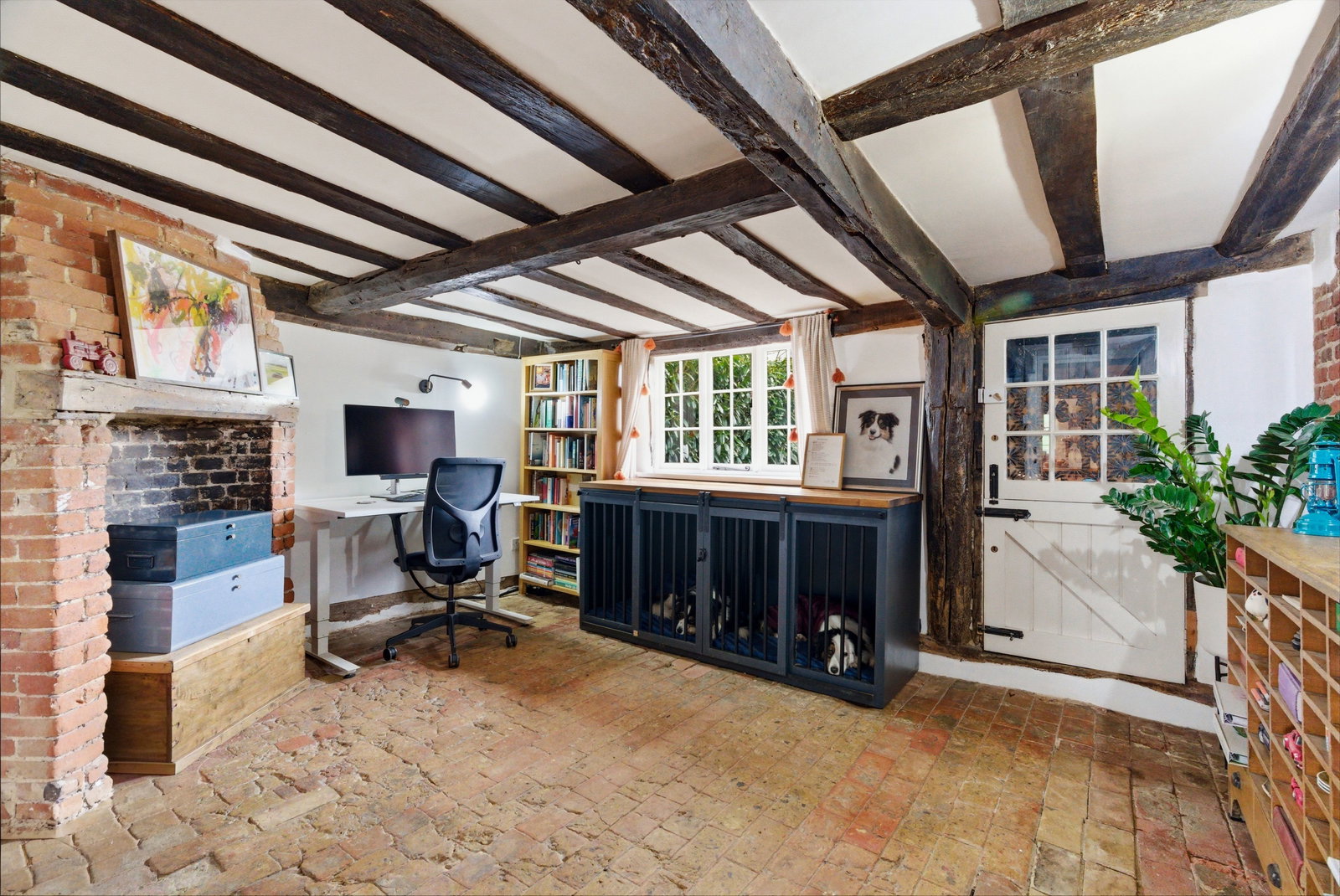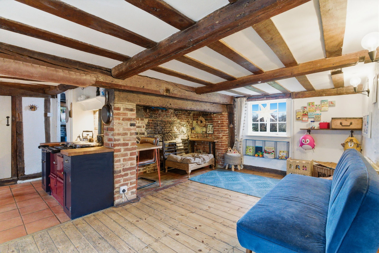 A separate family room provides a wonderfully convivial space for entertaining, centred around a substantial inglenook fireplace, its brick surround and heavy bressummer beam forming a natural focal point. Period detailing continues throughout, with exposed framework and sympathetic finishes complementing the cottage’s heritage. The kitchen is both practical and inviting — thoughtfully arranged to serve everyday family life while retaining the warmth and charm expected of a home of this era. Generous preparation space and traditional cabinetry sit comfortably alongside the historic fabric of the building, while adjoining areas provide useful ancillary storage and functionality.