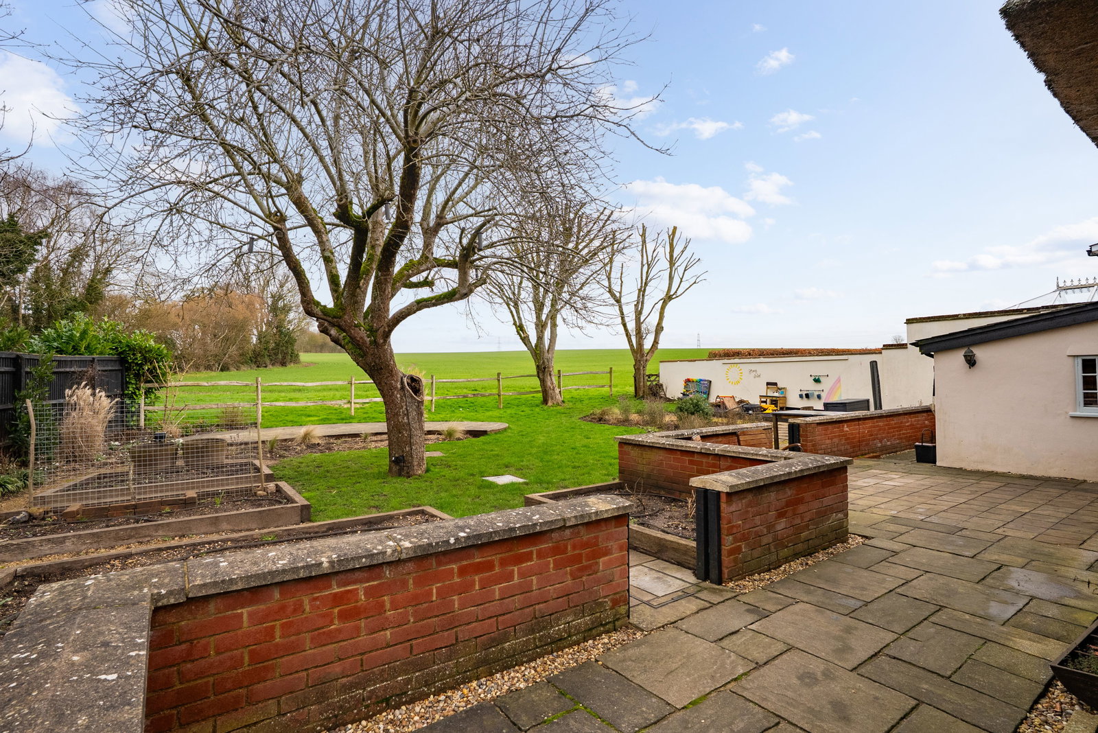 Backing onto open fields, the sense of outlook and breathing space is rare for a central village position. The result is a garden that feels both protected and expansive — ideal for families, keen gardeners or those simply seeking a peaceful rural retreat.