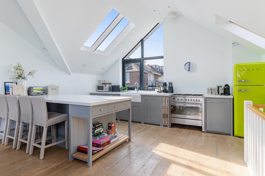 A further flight of stairs leads to the second floor, which is undeniably the heart of the home. Designed to maximise light, space and the stunning outlook, the open-plan kitchen, living and dining area offers breathtaking views from every angle. A vaulted ceiling enhances the sense of space, while expansive floor-to-ceiling glass doors with a Juliet balcony perfectly frame the surrounding scenery. This is a truly exceptional space, ideal for relaxing, entertaining, and enjoying the spectacular setting. The kitchen area is equally well-appointed, thoughtfully designed to complement the architecture and make the most of the light and views.