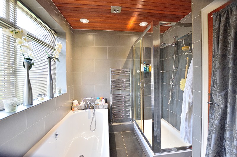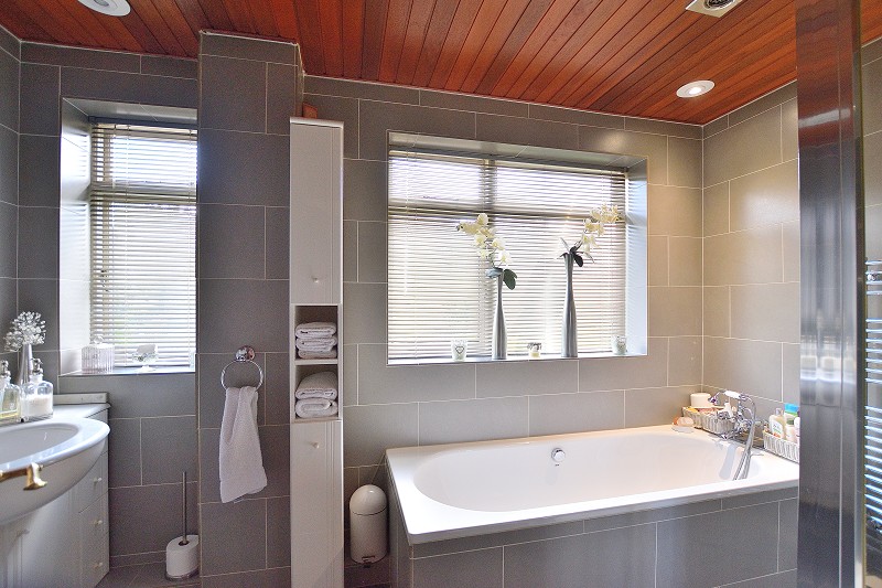 BATHROOM: Porcelain floor and wall tiles. Bath with tiled sides. Mixer tap/flexi shower. Fitted basin and storage with marble top. Back to wall W/C. Separate shower cubicle with thermostatic shower valve. Chrome towel rail. 2 x timber windows to front aspect. Extractor fan.