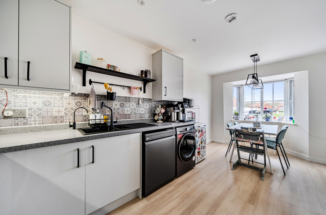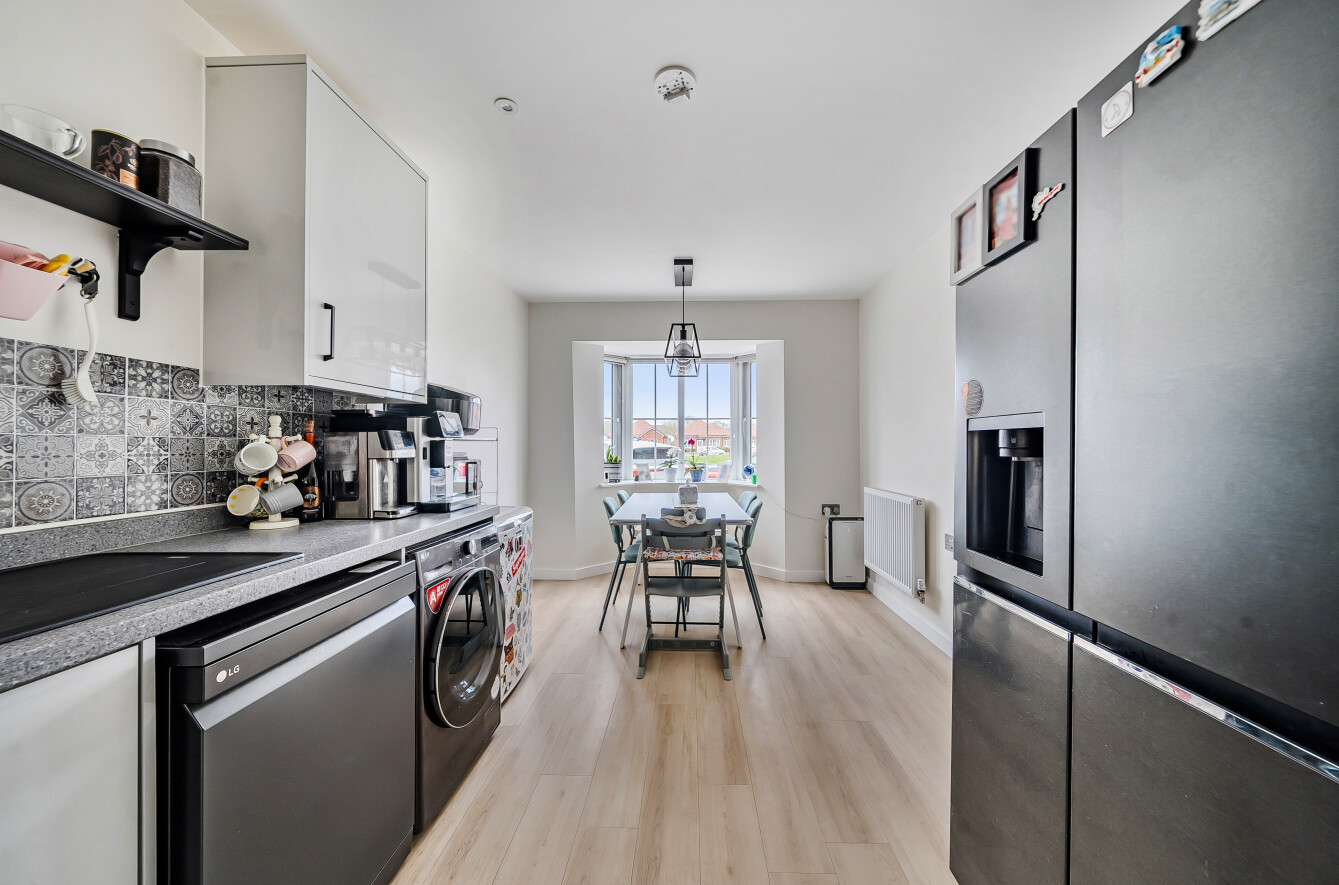 The ground floor comprises a welcoming entrance hall leading through to a bright and comfortable sitting room, along with a stylish kitchen and dining area. The kitchen is fitted with contemporary units and provides ample space for family dining, with doors opening directly onto the garden, creating an excellent flow for both everyday living and entertaining.
