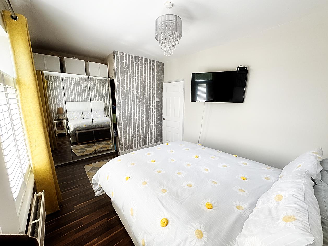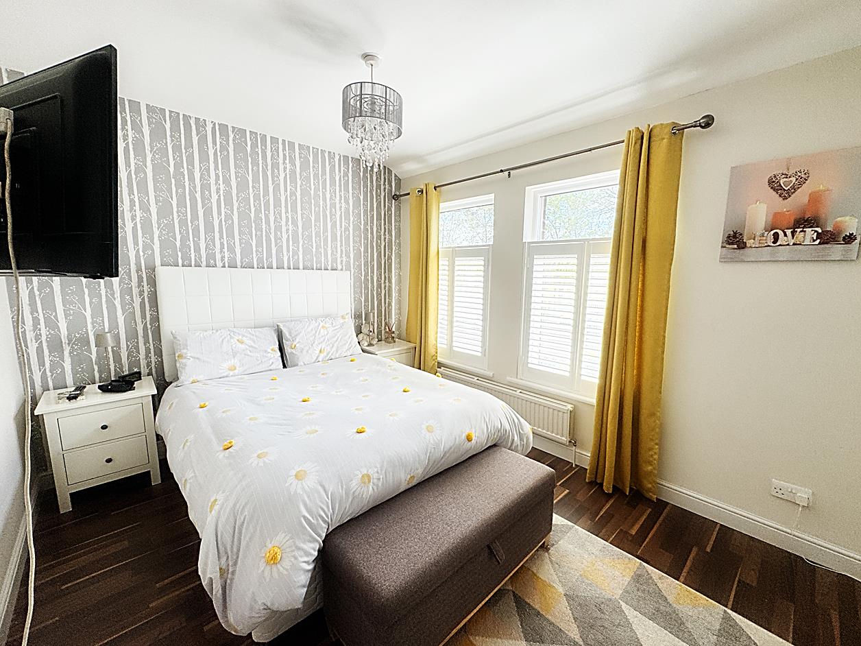 Bedroom 1 - 4.60 max x 3.00 (15'1" max x 9'10") - Front Elevation. Storage cupboard, two double glazed windows, plantation shutters, radiator and laminate flooring.